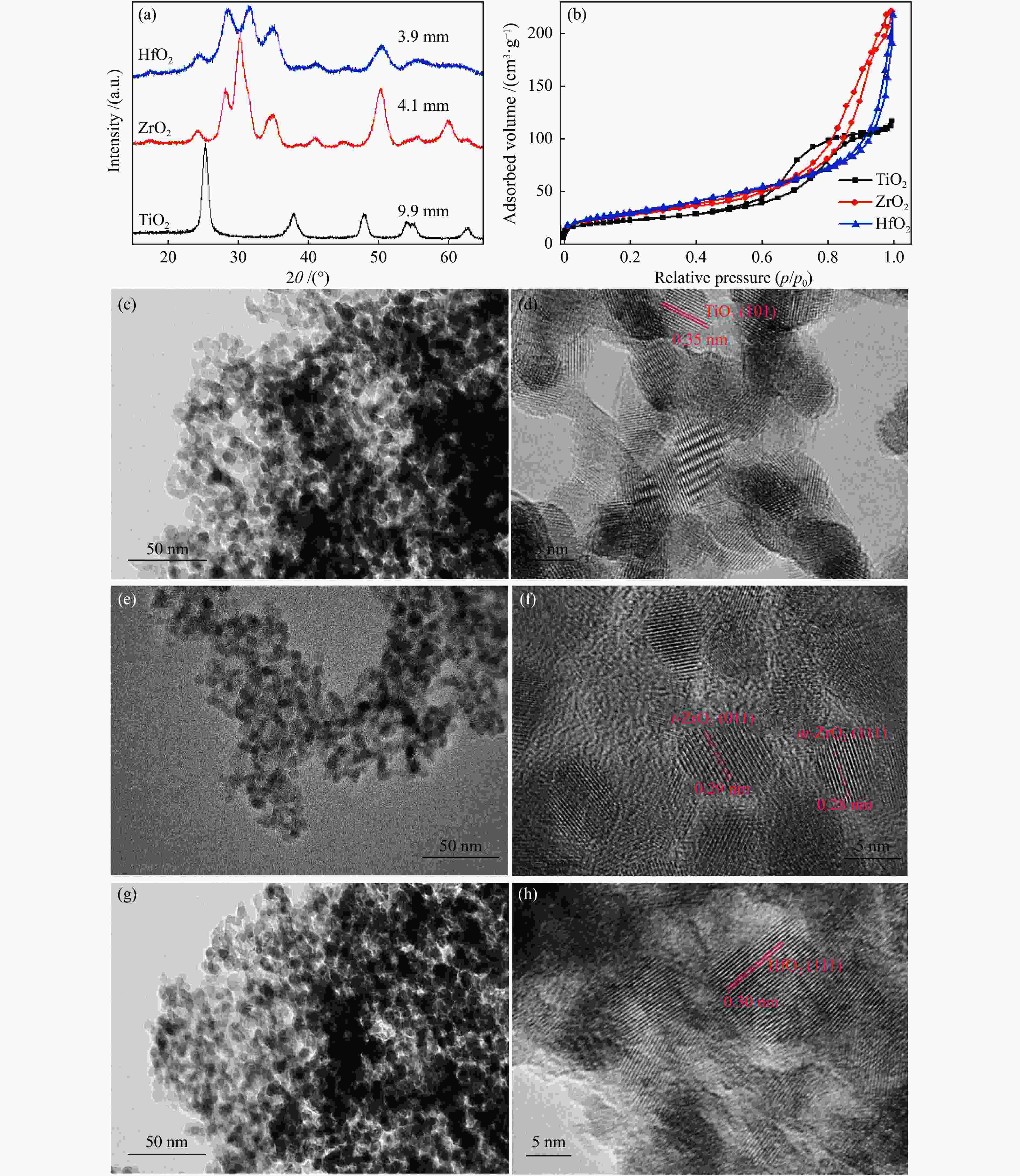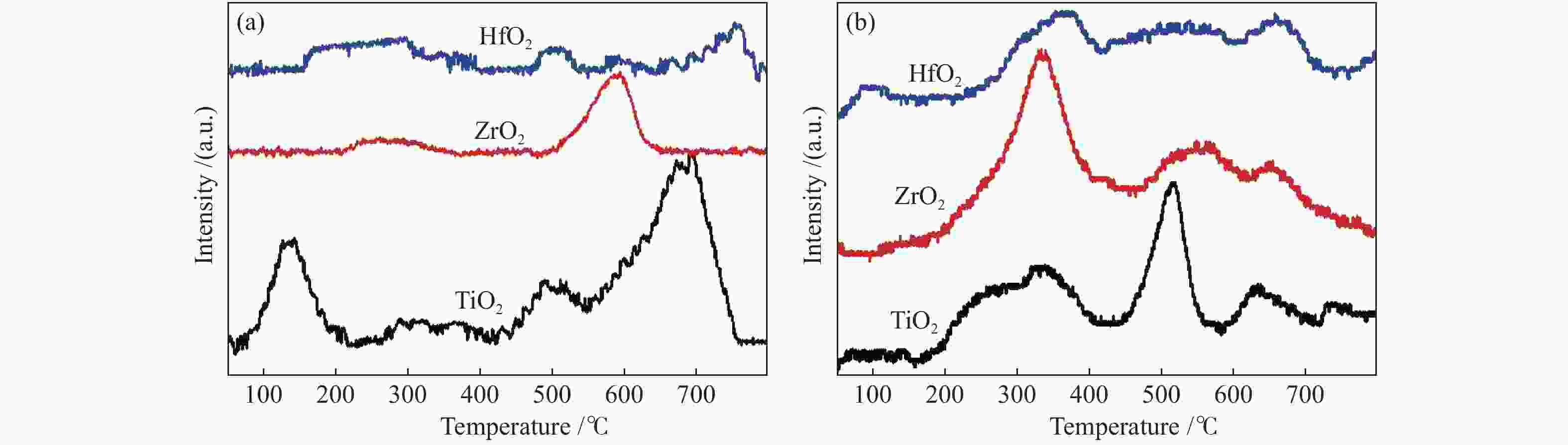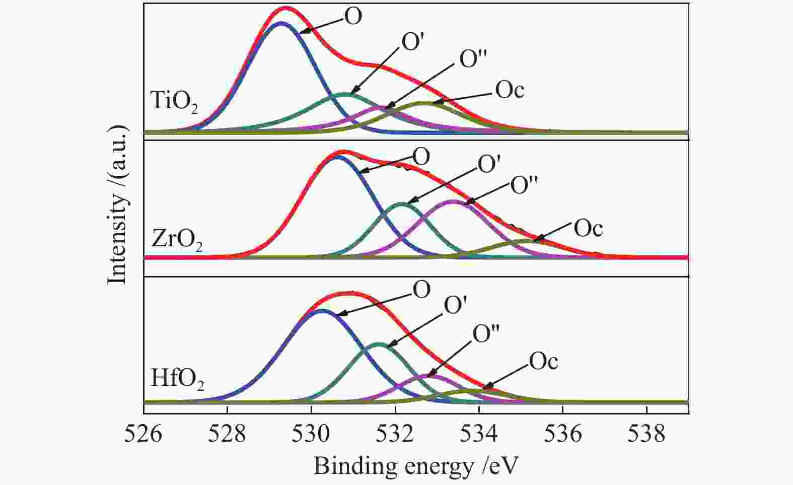 图 2 金属氧化物的结构特征(a)XRD谱图,(b)N2吸附-脱附等温曲线,(c)和(d)为TiO2的TEM照片,(e)和(f)为ZrO2的TEM照片,(g)和(h)为HfO2的TEM照片 Figure 2 Structural characteristics of metal oxides, (a) XRD pattern, (b) N2-adsorption and desorption isotherm, (c) and (d) TEM pictures of TiO2, (e) and (f) TEM pictures of ZrO2, (g) and (h) TEM pictures of HfO2 表 1 金属氧化物的结构性质 Table 1. Textural properties of metal oxides Sample SBET /(m2·g−1) vtotal /(cm3·g−1) Dave /nm Cave /nm TiO2 74 0.18 9.73 9.9 ZrO2 97 0.32 13.52 4.2 HfO2 111 0.33 12.06 3.9 note: SBET , vtotal , Dave and Cave are the specific surface area, pore volume, pore size and grain size of metal oxides, respectively 表 2 金属氧化物的H2、CO脱附温度及相应的脱附量 Table 2. H2, CO desorption temperatures and corresponding desorption amounts of metal oxides Sample t1 /℃ t2 /℃ I1 /(μmol·g−1) I2 /(μmol·g−1) H/C (ratio) TiO2 H2-TPD 50−220 220−410 60.79 5.17 0.75 CO-TPD 161−405 87.69 ZrO2 H2-TPD 201−367 2.49 0.01 CO-TPD 172−432 233.55 HfO2 H2-TPD 145−382 46.13 0.66 CO-TPD 50−139 238−416 53.81 16.56 表 3 金属氧化物中O 1s的结合能及相对氧物种的分数 Table 3. Binding energy and the corresponding surface atomic concentration of O 1s in metal oxides Sample Binding energy /eV I /% BE1 BE2 BE3 BE4 I1 I2 I3 I4 I2+I3 TiO2 529.28 530.80 531.68 532.68 49.52 22.26 12.82 15.39 35.08 ZrO2 530.14 532.16 533.18 535.14 46.66 19.65 26.00 7.68 45.65 HfO2 530.02 531.60 532.80 533.82 55.40 26.41 12.10 6.08 38.51