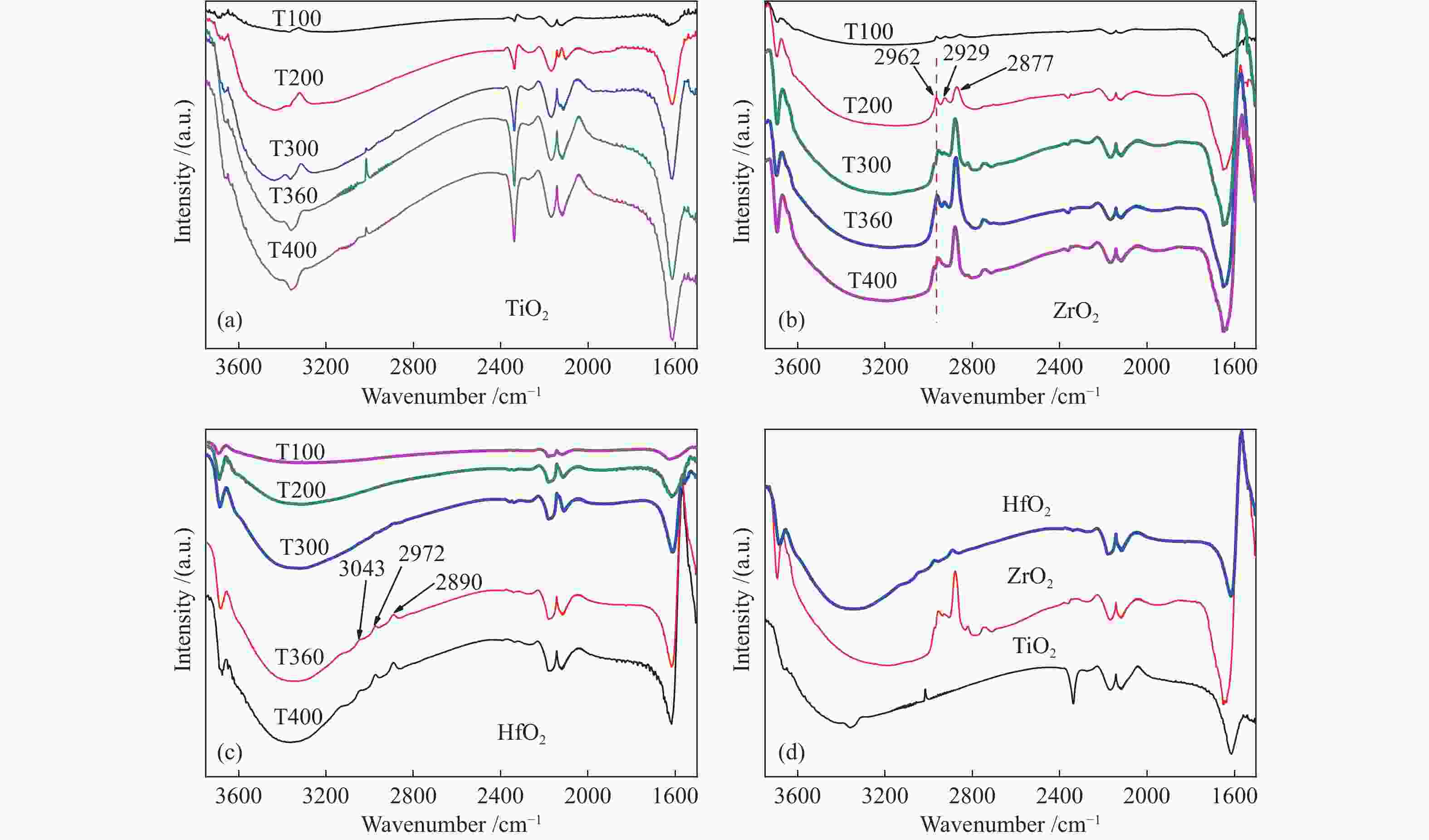 芳烃作为大宗石化产品的基础原料,目前,其生产主要依赖于石油催化重整、石脑油蒸气裂解副产物以及少量的煤焦油加氢和催化裂化[1]。为了应对石油资源的减少以及芳烃市场需求量的不断增加,寻求芳烃生产的新方法和新技术变的日益迫切[2]。相较于最先提出的合成气两步法制芳烃(即合成气制甲醇、甲醇制芳烃),合成气一步法制芳烃在热力学利用率和经济效益上具有明显的优势[3, 4]。 目前,根据合成气一步法制芳烃反应过程中中间体产物的不同[4],可以将合成气制芳烃简单的分成费托路线和甲氧基物路线两种途径[5]。费托路线就是利用费托催化剂与ZSM-5分子筛复合,反应过程中产生的烯烃(或烯醇)中间体产物扩散到分子筛中进行芳构化;甲氧基路线则是利用甲醇催化剂与ZSM-5分子筛复合,反应过程中产生甲氧基(或甲醇等含氧中间体产物,即CHxO*)扩散到分子筛中进行芳构化[6, 7]。因此,这种可以直接催化合成气获得芳烃的催化剂也被称作双功能催化剂。在合成气催化反应中,原料气体CO和H2的活化是整个反应能够发生的关键因素,通常认为,金属氧化物或碳化金属等晶体的棱、顶点以及晶体中的缺陷位点是合成气的活性中心[8-10]。因此,研究者们提出,双功能催化剂中金属氧化物的氧空位是影响合成气制芳烃的关键因素之一[11, 12]。TiO2金属氧化物,不仅具有价格低廉、环境友好、化学性质稳定等特点,还具有较高浓度的表面氧空位和内部氧空位,因此,常被用于光催化、烷烃脱氢以及CO的催化氧化[13-15]。在HfO2金属氧化物中,氧空位是HfO2中最为常见的一种空位缺陷,高浓度的氧空位可以有效地提高HfO2的电荷捕获能力。TiO2、ZrO2和HfO2均属于钛副族氧化物,不仅均具有较高浓度的氧空位,而且其金属氧化物的价态也相同(一般为+4),但是目前只有ZrO2与ZSM-5分子筛复合作为双功能催化剂[16, 17],却很少见作为同族的TiO2和HfO2与ZSM-5分子筛复合用于催化合成气反应。 此外,在甲醇路线的双功能催化剂中,一般认为,CO和H2首先在金属氧化物表面生成中间体产物,然后进一步扩散到分子筛中进行反应[18, 19]。由于合成气制甲醇反应机理的复杂性[20, 21],导致甲醇催化剂与分子筛复合的双功能催化剂的反应机理存在较多争议,而争议点主要集中在金属氧化物表面中间体产物的种类[4, 12, 22]。 因此,本研究通过超临界的方法制备了纳米金属氧化物TiO2、ZrO2和HfO2,研究了三种钛副族金属氧化物的结构性质、表面氧空位以及金属氧化物表面中间体产物的种类对双功能催化剂催化CO加氢性能的影响。 1. 实验部分1.1 实验药剂五水硝酸锆(Zr(NO3)4·5H2O,REO),氯化钛(TiCl4,AR)和氯化铪(HfCl4,AR)上海麦克林生化科技有限公司。乙醇(CH3CH2OH,≧99.7%,AR),山西同杰化学试剂有限公司。氨水(NH3·H2O,NH3含量25%−28%),洛阳市化学试剂厂。硝酸铵(NH4NO3,AR),台云市粤侨试剂塑料有限公司。ZSM-5分子筛(SiO2/Al2O3=30),南开大学化工试剂厂。以上所用试剂均未进行进一步提纯处理。 1.2 催化剂的制备金属氧化物的制备:分别取一定量的Zr(NO3)4·5H2O、TiCl4和HfCl4加入到乙醇中,在室温下搅拌溶解。将配制的氨水(体积比NH3·H2O =1∶3)缓慢地滴加到上述溶液中至pH值为8左右,快速搅拌得到溶胶。取一定量的上述溶胶,置于反应釜中,在温度为240 ℃时,采用超临界乙醇的方法分别得到ZrO2、TiO2和HfO2的前驱体,置于烘箱中110 ℃充分干燥。取出ZrO2、TiO2和HfO2的前驱体置于马弗炉中以5 ℃/min的升温速率将温度缓慢地升高到430 ℃,继续在430 ℃下煅烧6 h得到纳米ZrO2、TiO2和HfO2。 H-ZSM-5分子筛的制备:取一定量的ZSM-5分子筛,使用1 mol/L的NH4NO3溶液80 ℃搅拌6 h,抽滤,继续加入NH4NO3溶液,搅拌抽滤,该过程重复三次后取出,烘干。将烘干的ZSM-5分子筛置于马弗炉中,在550 ℃下煅烧6 h,取出备用。后续文中所使用的ZSM-5分子筛,如无特别指出,均为此处所制备的H-ZSM-5分子筛。 双功能催化剂的制备:分别取金属氧化物(即上述纳米ZrO2、TiO2和HfO2)与ZSM-5进行研磨混合,其中,金属氧化物与ZSM-5分子筛的质量比为1∶2,将金属氧化物与ZSM-5分子筛在研钵中充分研磨混合均匀后压制成40−60目的颗粒得到双功能催化剂Zr/HZ、Ti/HZ和Hf/HZ。采用同样的方法,将石英砂(小于100目)分别与金属氧化物置于研钵中充分研磨混合后压制成40−60目的颗粒得到金属氧化物催化剂,依次记作Zr/Si、Ti/Si和Hf/Si。 1.3 催化剂的表征采用日本理学的Smartlab型X射线衍射仪对所制备的金属氧化物的物相及组分进行测试。衍射光源为Cu Kα射线,电压和电流分别为40 kV和30 mA。测试5°−70°,扫描速率为10(°)/min。 采用美国麦克仪器公司型号为ASAP2460对金属氧化物进行低温N2物理吸附-脱附测试。0.1 g的金属氧化物置于样品管中,在真空环境中加热至200 ℃保持12 h脱出样品中的杂质,然后在77 K条件下进行N2的物理吸附-脱附测试。比表面积、孔体积和孔径尺寸依次采用BET、t-plot和BJH法分析。 采用日本株式会社型号为JEM-2100F的TEM对样品的微观形貌进行表征。取少量金属氧化物粉末置于无水乙醇中,使用超声分散5 min后,取少量待测样品滴至碳支持膜上,干燥至乙醇完全脱出,然后将金属氧化物至于样品台上进行TEM测试。 采用美国麦克仪器公司型号为AutoChemⅡ的全自动多功能吸附仪对样品的H2吸附能力进行测试。取0.1 g金属氧化物置于U型管中,在200 ℃下通入Ar脱出金属氧化物中的杂质,然后将Ar切换成10%H2/Ar,同时将