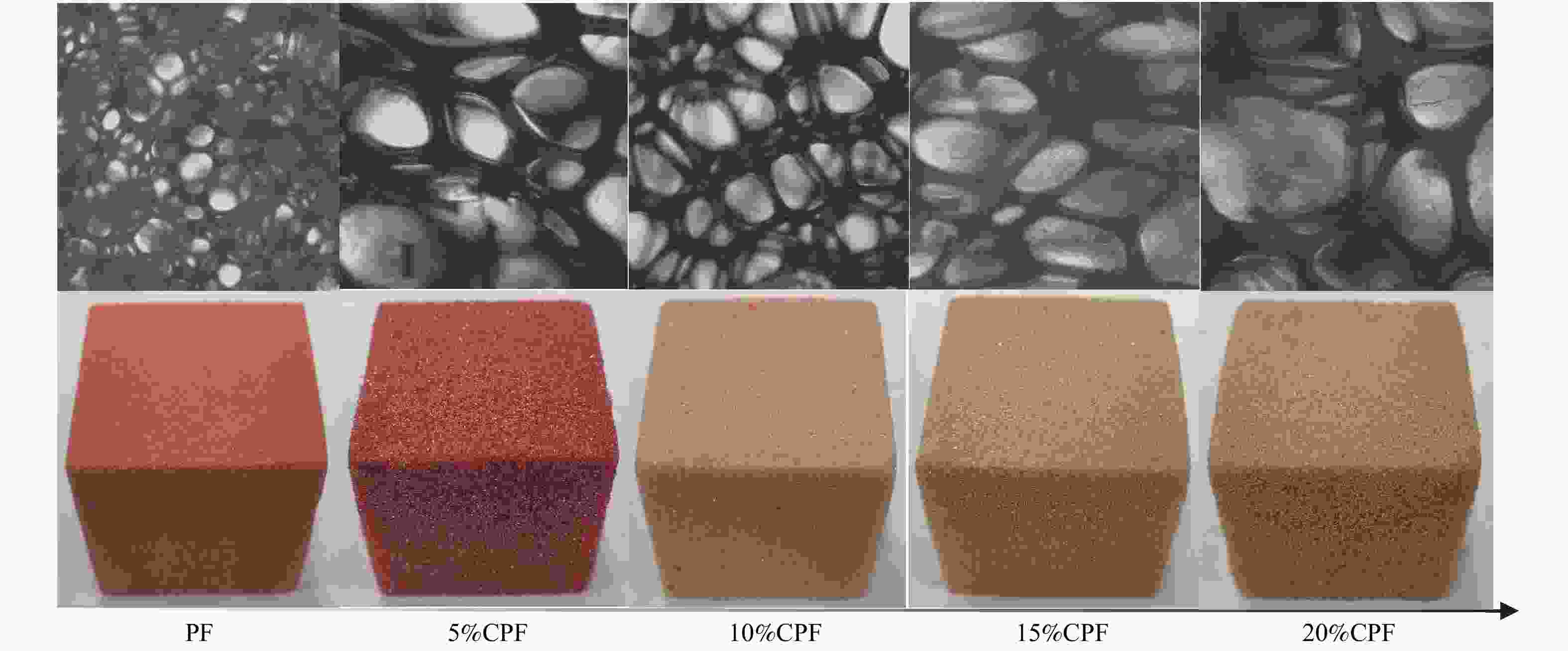 表 1 煤焦油酚醛树脂的基本特性 Table 1. Basic characteristics of coal tar phenolic resins Resin PR 5%CPR 10%CPR 15%CPR 20%CPR Viscosity/(Pa·s) 1.58 5.74 5.35 7.96 14.98 Solid content/% 78.6 82.3 84.6 79.2 71.1 表 2 高温煤焦油的GC/MS分析 Table 2. GC/MS analysis of high temperature coal tar Compound RC/% Compound RC/% Arenes 78.31 other arenes 0.16 Indene 19.30 pyridines 3.44 Naphthalene 8.77 2,4-dimethylpyridine 1.16 Indane 8.14 pyridine 0.67 1,2,4-trimethylbenzene 6.61 2-methylpyridine 0.54 Ethylbenzene 5.48 3,4-dimethylpyridine 0.42 1,2-xylene 5.39 2,6-dimethylpyridine 0.32 1,2,3-trimethylbenzene 5.22 2,3,6-trimethylpyridine 0.30 Toluene 3.91 other pyridines 0.03 Styrene 3.54 benzofuran 3.74 1-ethyl-3-toulene 3.24 benzonitrile 3.73 3-methylindene 2.68 7-methylbenzofuran 2.40 (1-methylcycloprop-2-en-1-yl)benzene 1.10 1,1-dimethyl-N,N'-diphenylsilanediamine 1.43 1,3-dimethyl-5-ethylbenzene 0.78 1,2,3,4-tetramethylfulvene 1.03 1-methylindane 0.77 o-methylaniline 1.01 5-methylindane 0.58 m-methylaniline 0.52 1-ethenyl-2,6-xylene 0.53 3-phenyl-2-acrolein 0.92 o-isopropyltoluene 0.52 2-methyl-1,2,3,4-tetrahydroquinoline 0.65 2-phenyl-1-propene 0.51 o-tolunitrile 0.62 1-isopropenyl-2-toulene 0.27 acetophenone 0.27 2,5-dimethylstyrene 0.24 thianaphthene 0.14 Cumene 0.20 2,3-dimethylthiophene 0.10 Prop-1-yn-1-ylbenzene 0.17 2,4-dimethylphenol 0.02 1-methyl-2,5-xylene 0.10 other compounds 1.67 Propylbenzene 0.10 RC: relative content 表 3 煤焦油酚醛泡沫的基础特性 Table 3. Basic characteristics of coal tar phenolic foams Foam Density/