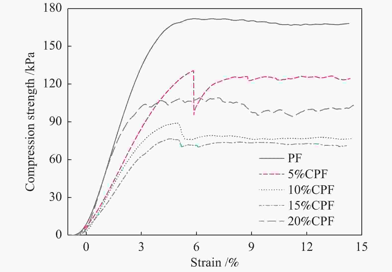 与聚氨酯等泡沫相比,酚醛泡沫由于具有良好的隔热性能、高温稳定性,特别是优异的阻燃性能(无滴燃烧、低燃烧性、低烟雾密度和烟雾毒性),受到广泛关注[1]。然而,由于酚醛泡沫刚性化学结构使其具有较高的脆性,从而极大地限制了其应用。因此,许多研究通过化学改性和填料添加等方法来提高泡沫的机械强度[2]。随着对酚醛泡沫的需求日益增加,对生产原料的需求也在增大。目前,苯酚主要来自于石油化工,成本相对较高,且易受国际原油价格的影响而波动[3]。因此,寻找石油基苯酚的替代品,一定程度上减少人们对石油的依赖。 近年来,使用生物质及其衍生物替代石油基苯酚受到了人们的密切关注,相关研究也日益增加[4]。Li等[5]通过解聚木质素制备了高苯酚替代率(30%−50%)的生物基酚醛泡沫;Wang等[6]和Zhou等[7]利用固体酸催化酚化木质素,降低了木质素的分子量,提高了木质素的酚羟基含量和反应活性,从而制备了性能较好的木质素基酚醛泡沫。除了通过对木质素进行解聚来改善酚醛泡沫的性能外,也可以增加填料制备复合材料,例如添加多壁碳纳米管[8]或者杨树纤维和异氰酸酯端部聚氨酯预聚物[9]制备的木质素基酚醛泡沫的机械强度明显提高。腰果酚[10,11]、单宁[12]等含有酚羟基的生物质也可以用来替代石油基苯酚,Bo等[11]对腰果酚进行化学修饰添加含磷化合物,提高了酚醛泡沫的阻燃性能;Yu等[13]研究表明,含混合酚的生物油也可部分替代苯酚制备酚醛泡沫,其中,长链的化合物可以显著提高泡沫的韧性。 高温煤焦油是煤在高温干馏和气化过程中产生的液体副产物,产率占炼焦干煤的2.5%−4.0%。中国是产煤大国,据统计,每年高温煤焦油产量约2000万t[14]。煤焦油的组成成分非常复杂,含有上万种有机化合物,目前,使用气相色谱质谱联用仪(GC/MS)分析出的独立组分约有300种[15],在化工、医药等领域可作为高附加值的原材料[16]。目前,高温煤焦油主要加工利用方式有:分离精馏制备各种化工原料[17];催化加氢精制制备高附加值化学品和燃料[18];制备中间相沥青[19]。然而,上述加工利用方式存在过程复杂、能耗高、催化剂易失活、中间相沥青收率低等问题。高温煤焦油主要包含烷烃、芳烃、酚类化合物及少量的其他含氧和含氮化合物,有望直接部分替代苯酚制备酚醛泡沫,从而节省成本,减少对石油的依赖。 本研究以高温煤焦油、苯酚和甲醛为原料,合成可发泡性酚醛树脂,并通过发泡工艺制备了不同替代率的煤焦油酚醛泡沫(CPFs)。采用GC/MS分析了煤焦油的成分,利用傅里叶变换红外光谱仪(FT-IR)对酚醛泡沫化学结构进行了表征,重点研究了煤焦油酚醛泡沫的表观形貌、压缩强度、粉化率、热稳定性、阻燃性能和隔热性能。结果表明,煤焦油酚醛泡沫的粉化率有所降低,即提高了韧性,同时具有优异的热稳定性、阻燃性能和隔热性能。本研究以煤焦油的高值化和低碳化利用为目标,为低成本制备酚醛泡沫提供了一条新途径。 1. 实验部分1.1 实验原料选用宝武集团马钢煤焦化公司的高温煤焦油为研究对象,碱萃取法测得煤焦油中酚类化合物含量为3.2%。实验所用其他药品包括甲醛水溶液(37%)、氢氧化钠、苯酚、乙酸、正戊烷、对甲苯磺酸和吐温-80均为国药集团化学试剂有限公司生产的市售分析纯试剂。 1.2 实验方法1.2.1 煤焦油酚醛树脂的制备以苯酚(含高温煤焦油)/甲醛/氢氧化钠(物质的量比为1∶1.8∶0.1)为原料,合成不同替代率(0、5%、10%、15%、20%,以苯酚的质量计)的酚醛树脂。先将苯酚预热至液态,向三颈烧瓶中依次加入苯酚、高温煤焦油和质量分数为15%的NaOH水溶液,升温至85 ℃后反应0.5 h,然后用恒压滴液漏斗缓慢滴加甲醛水溶液,滴加完成后继续反应2 h,然后降温至60 ℃,用乙酸将pH值调至中性,最后用旋转蒸发仪在55 ℃下减压蒸馏除去水分,得到黏度和固含量适中的可发泡煤焦油酚醛树脂(分别记为PR、5%CPR、10%CPR、15%CPR、20%CPR)。煤焦油酚醛树脂的基本特性见表1。 表 1Resin PR 5%CPR 10%CPR 15%CPR 20%CPR Viscosity/(Pa·s) 1.58 5.74 5.35 7.96 14.98 Solid content/% 78.6 82.3 84.6 79.2 71.1 1.2.2 煤焦油酚醛泡沫的制备取50 g树脂,依次加入1.25 g吐温-80(表面活性剂)、5 g正戊烷(发泡剂)、10 g对甲苯磺酸(固化剂),快速搅拌均匀后倒入模具中,放入烘箱中70 ℃发泡固化40 min,得到煤焦油酚醛泡沫。根据煤焦油替代苯酚质量为0、5%、10%、15%、20%时,煤焦油酚醛泡沫分别记为PF、5%CPF、10%CPF、15%CPF、20%CPF。 1.3 性能测试与结构表征采用日本岛津公司的QP2010 Plus GC/MS分析高温煤焦油。色谱柱型号为HP-5ms(长30 m、内径0.25 mm、膜厚0.25 μm)。升温程序为:由60 ℃升至280 ℃,保持10 min,升温速率为5 ℃/min。 采用美国赛默飞世尔公司的HAAKE MARS III旋转流变仪测定酚醛树脂的黏度;依据GB/T 14732—2006测定固含量。 采用美国赛默飞世尔公司的NICOLET 6700 FT-IR分析酚醛泡沫的官能团结构;采用光学显微镜观察泡沫的泡孔结构;采用瑞典Hot Disk 公司的TPS 2500S导热系数分析仪测定泡沫的导热系数;采用德国NETZSCH公司的STA449 F3热重分析仪(TGA)考察酚醛泡沫的热稳定性,温度由35 ℃升至700 ℃,升温速率为10 ℃/min,氩气气氛,测试气体流量为20 mL/min。分别依据GB/T 6343—2009、GB/T 8813—2008和GB/T 2406.2—2009测定表观密度、压缩性能和极限氧指数;参考Ge等[20]的方法测定粉化率:样品尺寸为 5 cm × 5 cm × 2 cm,测试方法为在发泡材料上放置200 g的