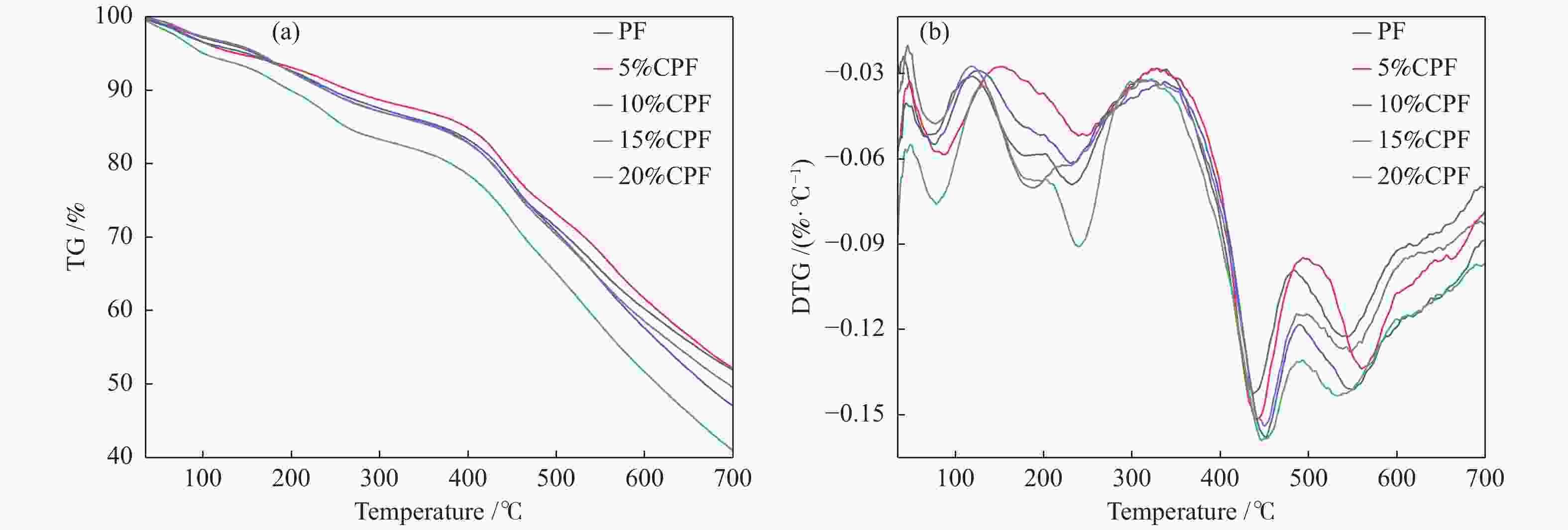 (W·m−1·K−1)PF 52.2 172.0 3.30 15.5 0.047 5%CPF 47.4 130.6 2.76 12.9 0.040 10%CPF 38.6 89.0 2.31 14.6 0.044 15%CPF 36.7 76.6 2.09 16.9 0.034 20%CPF 45.1 109.2 2.42 14.4 0.036 表 4 煤焦油酚醛泡沫的TG-DTG分析 Table 4. TG-DTG analysis of coal tar phenolic foams Sample t5%/℃ tmax/℃ Residual mass/% step II step III PF 156.8 246.1 447.1 51.7 5%CPF 139.6 244.4 441.5 52.2 10%CPF 148.7 230.2 451.1 47.1 15%CPF 150.7 240.5 446.2 41.1 20%CPF 163.3 231.1 448.6 49.6