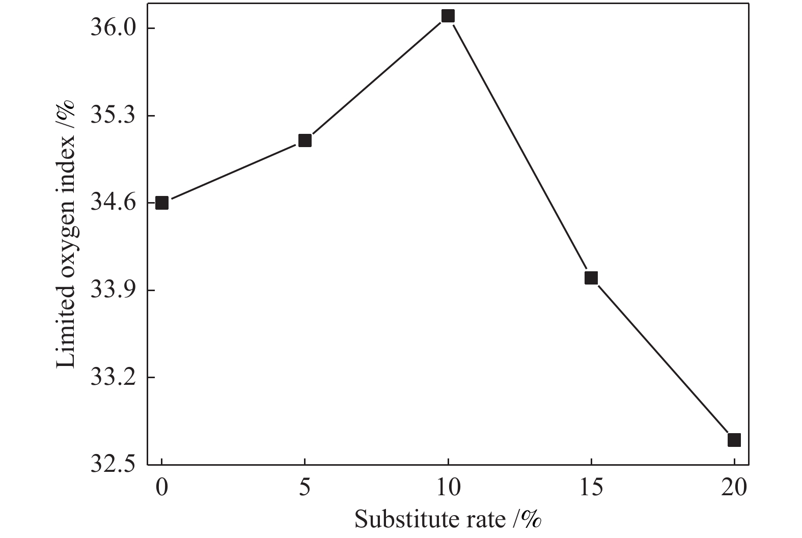 (W·m−1·K−1)PF 52.2 172.0 3.30 15.5 0.047 5%CPF 47.4 130.6 2.76 12.9 0.040 10%CPF 38.6 89.0 2.31 14.6 0.044 15%CPF 36.7 76.6 2.09 16.9 0.034 20%CPF 45.1 109.2 2.42 14.4 0.036 2.5 热稳定性图5是煤焦油酚醛泡沫在氩气气氛下35–700 ℃的TG-DTG曲线。 图 5从图5中可以看出,酚醛泡沫的热分解主要可分为三个阶段,具体分析结果见表4。热分解的初始阶段主要发生在40–200 ℃,泡沫的失重率为5%,这一阶段失重主要原因是泡沫中残留水分、发泡剂、游离甲醛和游离苯酚等的挥发,且煤焦油酚醛泡沫失重与纯酚醛泡沫相比相差不大,说明未反应的煤焦油组分强吸附在泡沫上。第二阶段的温度主要在200–300 ℃,由于泡沫中表面活性剂、固化剂的分解和醚键断裂释放水,导致热分解速率增加。第三阶段主要在350–700 ℃,泡沫在高温下化学结构被破坏,酚羟基等基团受热分解生成H2O、CH4、CO、CO2等挥发性气体,此阶段是泡沫的主要降解阶段[8]。 表 4Sample t5%/℃ tmax/℃ Residual mass/% step II step III PF 156.8 246.1 447.1 51.7 5%CPF 139.6 244.4 441.5 52.2 10%CPF 148.7 230.2 451.1 47.1 15%CPF 150.7 240.5 446.2 41.1 20%CPF 163.3 231.1 448.6 49.6 如表4所示,在初始阶段,煤焦油酚醛泡沫的t−5%随着替代率的增加而增加,当替代率为20%时比纯酚醛泡沫的t5%要高,说明高替代率的煤焦油能够提升泡沫在低温阶段的热稳定性。第二阶段温度随着替代率上升呈下降趋势,其主要是由于泡沫中吸附的高沸点煤焦油组分的挥发。与纯酚醛泡沫相比,煤焦油酚醛泡沫的残炭率降低,说明在高温阶段煤焦油对于酚醛泡沫的热稳定性具有一定的负面影响,其主要原因是煤焦油中含有的有机化合物在高温下挥发或分解所致。但是煤焦油酚醛泡沫的残炭率仍在40%以上,说明其具有良好的热稳定性。 2.6 极限氧指数极限氧指数是指在规定条件下在氮氧混合气体中燃烧材料所需的最低氧含量,氧指数大于27%的材料为难燃材料,是评估材料阻燃性能的一个重要参数[27]。图6显示了煤焦油酚醛泡沫的极限氧指数。从图6中可以看出,替代率为10%时,氧指数最高为36.1%。当煤焦油替代率低于10%时,酚醛泡沫的氧指数随着替代率的增加而增加,但是当替代率大于10%时,氧指数随着煤焦油替代率的增加而下降,其主要原因是煤焦油相比苯酚的反应活性较低,当替代率小于10%时,煤焦油反应较为充分,并且煤焦油中含有N、S等阻燃元素的化合物,能够提升酚醛泡沫的阻燃性能,但是替代率大于10%后,有部分未反应的煤焦油吸附在泡沫中,此外煤焦油中含有许多易燃的有机化合物,这些因素使得高替代率的煤焦油酚醛泡沫阻燃性能下降,但仍属于难燃材料。 图 62.7 隔热性能酚醛泡沫作为在冷藏和建筑外墙上广泛应用的保温材料,导热系数是其重要的参数,低导热性不仅可以更好地阻止热量传递,还可以减小泡沫板材的厚度,降低生产成本。绝热泡沫材料的热传递方式有四种:通过固体聚合物、通过泡孔内的气体、通过泡孔的热辐射和通过泡孔内气体的热对流[28]。测量了煤焦油酚醛泡沫在25 ℃下的导热系数(表3),从表3中可以看出,相比纯酚醛泡沫,煤焦油酚醛泡沫的导热系数更低,在替代率为15%时酚醛泡沫的导热系数最低为0.034 W/(m·K),而纯酚醛泡沫的导热系数为0.047 W/(m·K),导热系数减小了23%,说明煤焦油能有效地改善酚醛泡沫的隔热性能,且均能很好地满足保温材料的要求。 3. 结 论利用高温煤焦油部分替代苯酚,与甲醛合成煤焦油酚醛树脂,并通过发泡工艺制备了性能良好的煤焦油酚醛泡沫。与纯酚醛泡沫相比,煤焦油酚醛泡沫的压缩强度降低,同时粉化率有所降低,即泡沫的韧性得到改善。当替代率为5%时,泡沫的粉化率最低为12.9%,相比于其他替代率的酚醛泡沫,其压缩强度最高。通过热重分析,煤焦油酚醛泡沫在低温时热稳定性更强,并随替代率的增加而提高。当煤焦油替代率为10%时,泡沫的极限氧指数最高为36.1%,当替代率为15%时,导热系数最低为0.034 W/(m·K),所以煤焦油有效地增强了泡沫的阻燃性能和隔热性能。因此,高温煤焦油有望作为石油基苯酚的替代物,为煤焦油的高值化和低碳化利用提供了参考。