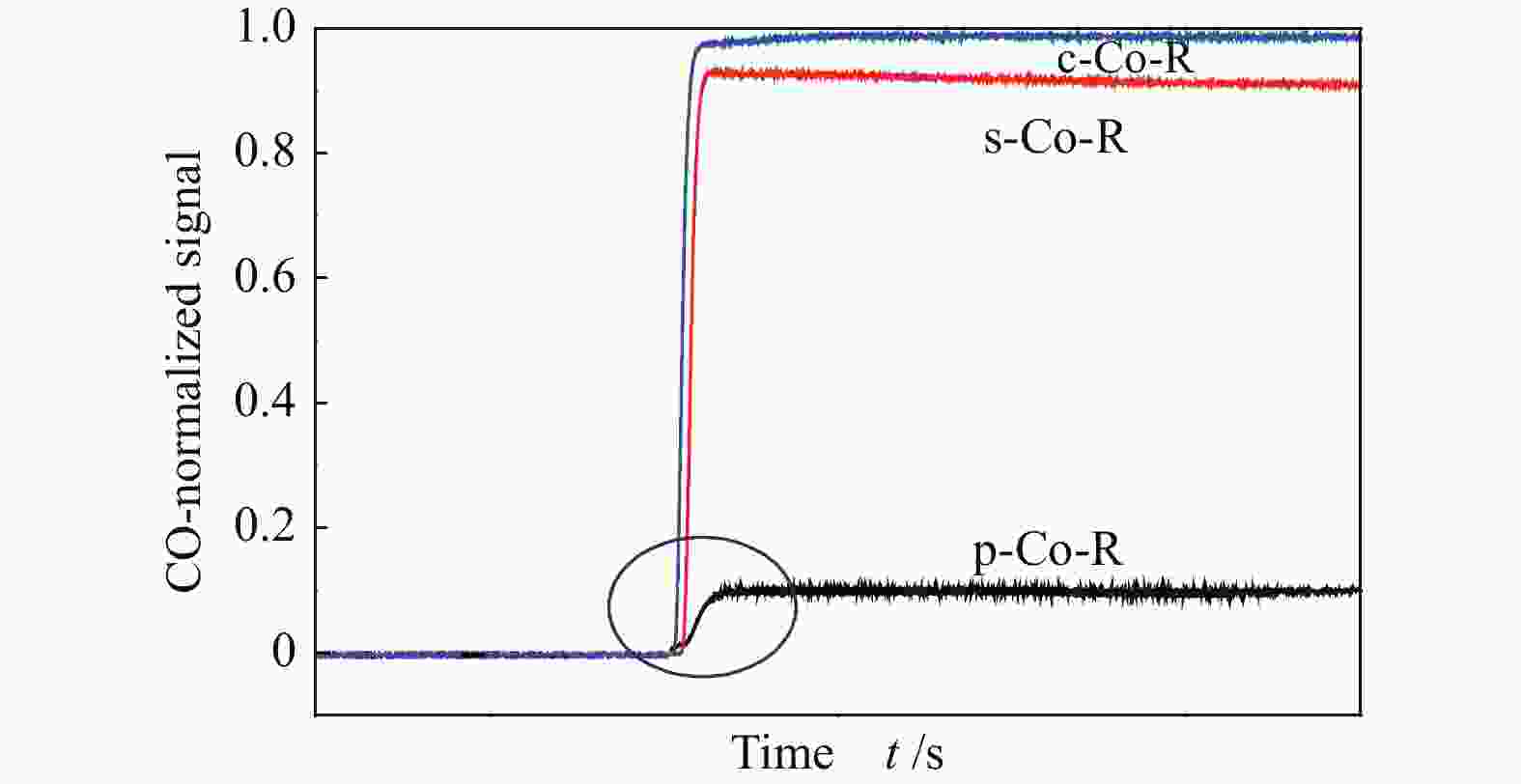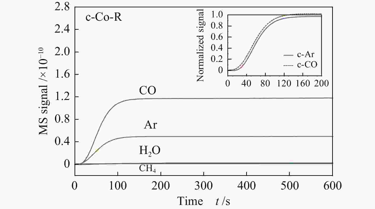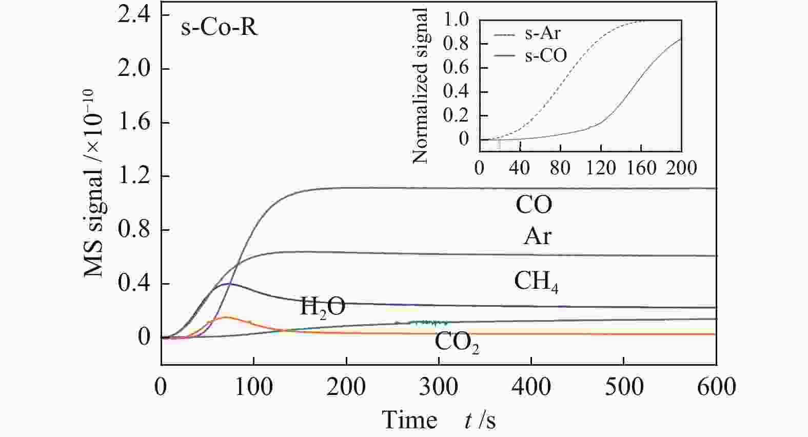 费托(F-T)合成[1]是合成气(CO+H2)在催化剂的作用下合成液体燃料或化学产品的工艺方法,是实现化石燃料清洁利用和开发的有效途径。费托合成催化剂体系主要包括铁(Fe)基、钌(Ru)基、钴(Co)基和镍(Ni)基等。由于Co基催化剂在费托合成中有反应活性高、水煤气变换反应活性低、高长链烃选择性、低CO2选择性、催化剂寿命长等优点,一直以来是费托合成反应催化剂体系的研究重点[2-5]。CO的活化是费托反应的起始步骤,是生成CHx物种的重要过程,同时也是碳链增长的前提,被认为是F-T合成反应的速率控制步骤[6]。 目前,对于CO解离方式的研究报道主要集中在理论计算方面。Liu等[7]基于第一性原理的动力学理论计算,认为在HCP Co上倾向于直接解离C≡O键,在FCC Co上倾向于以氢助解离的方式进行。Shetty等[8]发现在Co(10-10)晶面上,CO主要是通过直接解离的方式进行活化。Cheng等[9]研究了CO在平坦的Co(0001)表面和台阶状的Co(0001)表面的氢助解离过程。CO在台阶Co(0001)表面进行氢助解离生成HCO需要克服的能垒较低,表明台阶状的Co(0001)表面更有利于CO氢助解离。而Inderwildi等[10]表明在Co(0001)表面,CHx通过HCO和H2CO中间体形成,并不遵循碳化物机理。为了揭示CO加氢的相关机理,实验上采用化学瞬态技术跟踪反应器出口气氛的研究方法也有一定进展。化学瞬态动力学(Chemical Transient Kinetics)是研究大气压下催化反应动力学和相关反应机理的有力工具。1939年Wagner等[11]利用化学瞬态动力学来研究非均相催化反应,研究了催化剂在电化学固态系统中电导率的变化,并被Tamaru[12]用来表征多相催化中催化剂的吸附状态。Athariboroujeny等[13]利用化学瞬态动力学研究了Co-MnOx模型催化剂上CO在常压下的加氢反应,认为在单层极限的覆盖值下,CO的快速解离可能是由于氢的辅助作用和Mn2+的促进作用。Chen等[14]采用稳态同位素瞬态动力学分析(SSITKA)和化学瞬态动力学分析(CTKA)的方法研究了负载型Co基催化剂上CO加氢的反应机理,认为CO直接解离比CO氢助解离更为准确。显然,从以上文献来看,不同的研究团队,从理论计算和实验上对CO在Co基催化剂表面的解离方式给出了不同的研究结果。 众所周知,CO解离是费托合成过程的关键反应步骤[15],其解离路径取决于活性金属的表面结构以及活性位点的类型。目前,尚未从实验角度对特定晶面Co基催化剂的CO吸附能力和解离方式有直观的研究。本研究利用溶剂热法合成了三种暴露不同晶面的Co基催化剂,分别是台阶状(10-11)晶面的p-Co-R催化剂、平面状(0001)晶面的s-Co-R催化剂、锯齿状(11-20)晶面的c-Co-R催化剂。在排除载体、助剂以及颗粒尺寸对F-T合成反应性能影响的前提下,利用化学瞬变反应技术(CTK)研究了常压条件下CO在三种暴露不同晶面催化剂上的加氢反应,对费托合成的初始态动力学行为进行跟踪,并结合其他表征手段来研究CO的解离活化方式。 1. 实验部分1.1 催化剂的制备三种暴露不同晶面的Co基催化剂的制备过程采用Qin等[16]文献中报道的方法。 纳米片状钴催化剂的制备步骤如下:无水乙醇和去离子水各20 mL,4.8 g Co(NO3)2·6H2O和4 g PVP依次加入到上述混合溶液,在室温条件下磁力搅拌30 min后缓慢滴入0.4 mol/L NaOH稀溶液(100 mL)继续搅拌30 min,接着将上述溶液倒入到具有聚四氟乙烯内衬的不锈钢自压反应釜(200 mL)中,密封后在120 ℃条件下反应10 h。自然冷却之后产物经六次离心洗涤后在60 ℃下干燥12 h,最后在马弗炉中以1℃/min的升温速率升到500 ℃,煅烧5 h。最终在5%H2/N2的气氛下进行还原,记为p-Co-R。前期文献[16]表明,该纳米片状的p-Co-R催化剂主要暴露晶面为Co(10-11)。 纳米薄片状钴催化剂的制备步骤如下:在114 mL去离子水中依次加入0.75 g Co(CH3COO)2·4H2O和2.4 g PVP,在室温下搅拌30 min后倒入1 mol/L NaOH溶液(6 mL)继续搅拌20 min,接着将上述溶液倒入到具有聚四氟乙烯内衬的不锈钢自压反应釜(200 mL)中,密封后在180 ℃下反应24 h。自然冷却后,产物经六次离心洗涤后在60 ℃下干燥12 h,最后在马弗炉中以1 ℃/min的升温速率升到500 ℃,煅烧5 h。最终在5%H2/N2的气氛下进行还原,记为s-Co-R。前期文献[16]表明,该纳米薄片状的s-Co-R催化剂主要暴露晶面为Co(0001)。 纳米立方体状钴催化剂的制备步骤如下:向60 mL无水乙醇和40 mL去离子水的混合溶液中加入2.0 g Co(CH3COO)2·4H2O,室温下磁力搅拌20 min后倒入25%氨水(10 mL)继续搅拌20 min,接着将上述溶液倒入到具有聚四氟乙烯内衬的不锈钢自压反应釜(200 mL)中,密封后在170 ℃下反应3 h。室温下自然冷却后,产物经六次离心洗涤后在60 ℃下干燥12 h。最终在5%H2/N2的气氛下进行还原,记为c-Co-R。前期文献[16]表明,该纳米薄片状的c-Co-R催化剂主要暴露晶面为Co(11-20)。 1.2 催化剂的表征1.2.1 程序升温脱附(TPD)CO/(H2+CO)程序升温脱附是在Micromeritics Atochem 2910吸附仪结合在线质谱测定的,由质谱检测CO信号(m/z=28)。其具体测试步骤分别为: CO-TPD:首先将样品(100 mg, 60−80目)装入石英管中,通入纯氢以10 ℃/min的速率升温至400 ℃并保持6 h,随后切换成氩气降温至50 ℃,在50 ℃的条件下切换成CO吸附30 min,再切换成氩气吹扫掉样品表面弱吸附和气相的CO,最后在氩气气氛下以10 ℃/min的升温速率升温至800 ℃并记录。 (H2+CO)-TPD:首先将样品(100 mg, 60−80目)装入石英管中,通入纯氢以10 ℃/min的速率升温至400 ℃并保持6 h,随后切换成氩气降温至50 ℃,在50 ℃的条件下切换成H2吸附30 min,接着切换成C