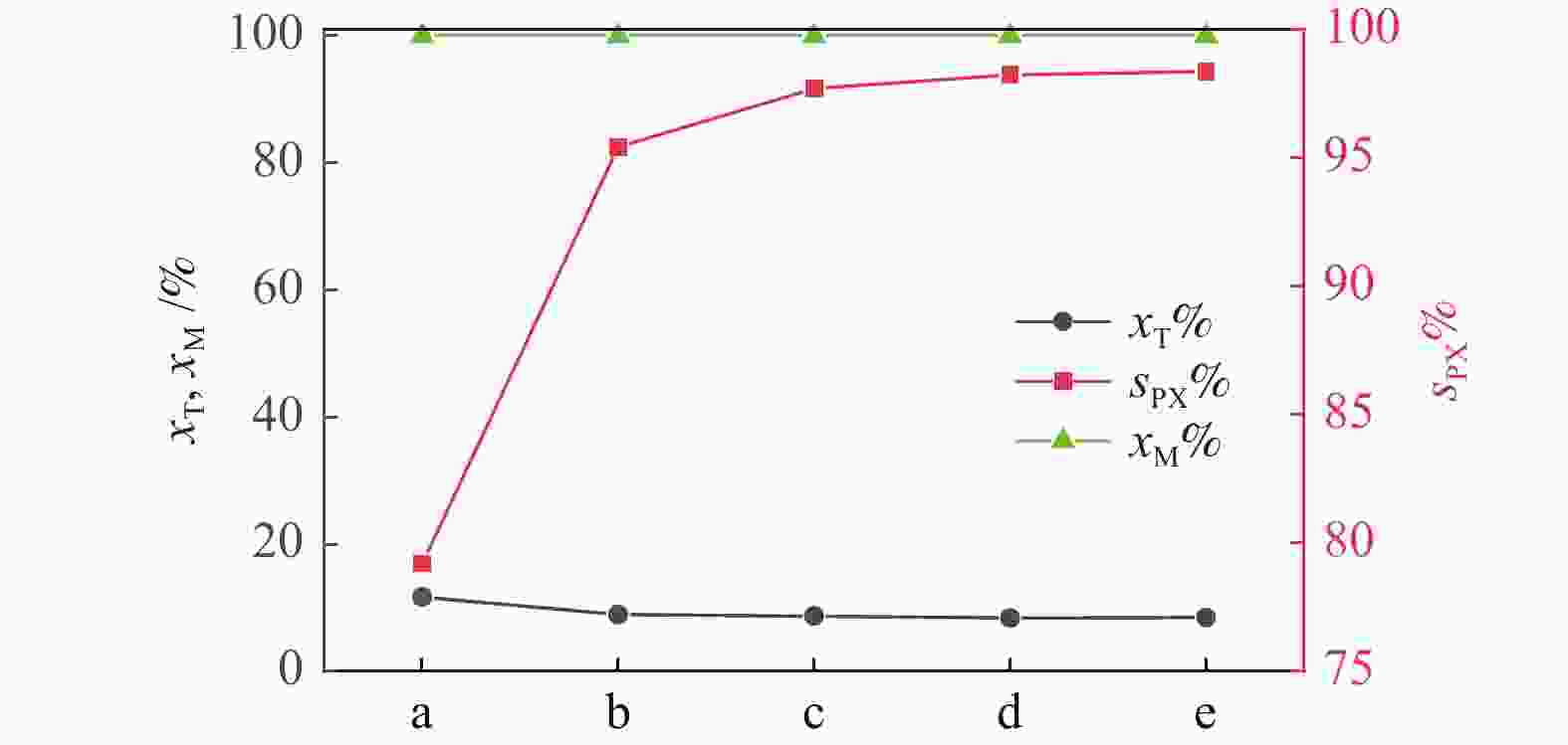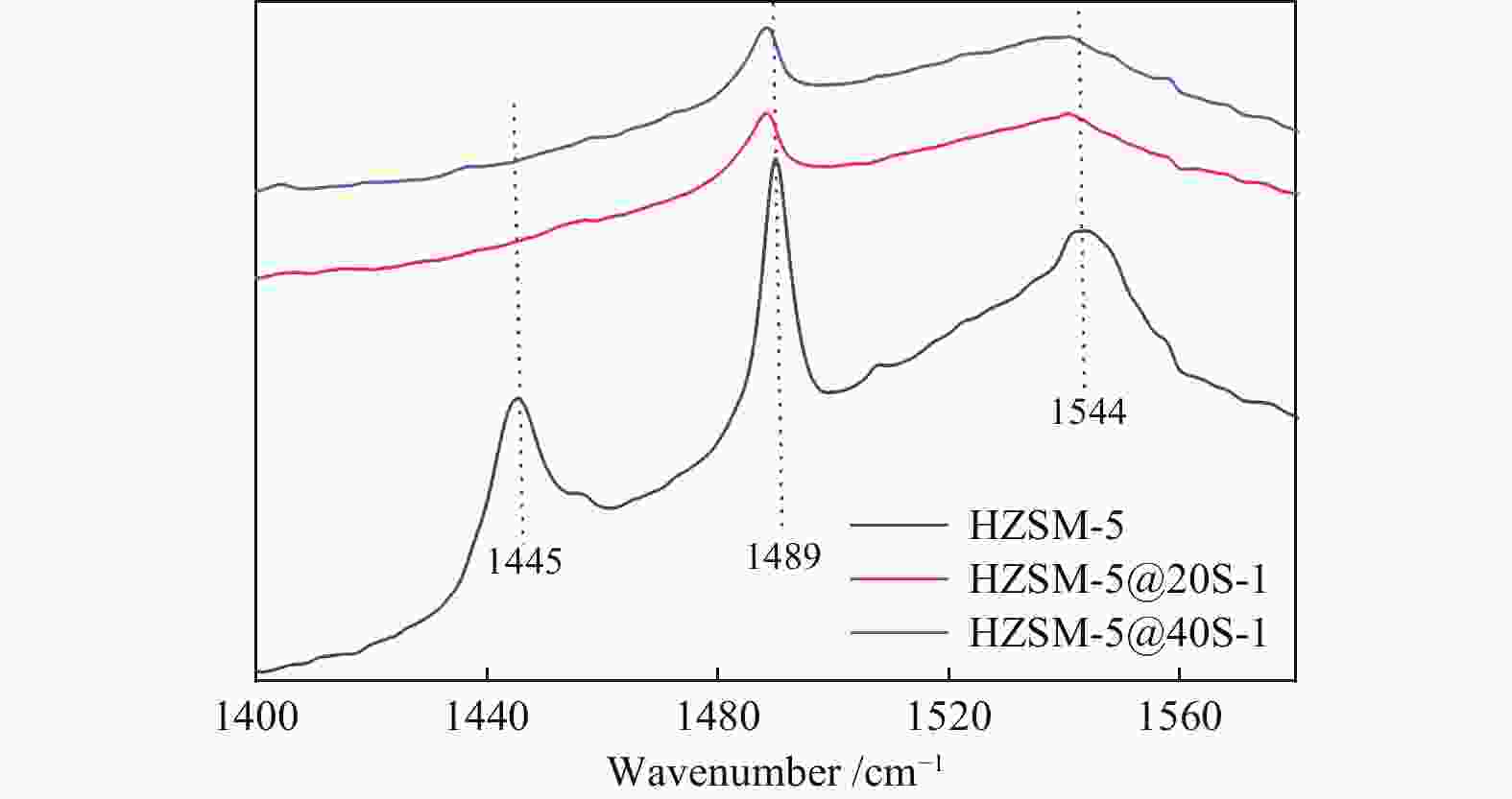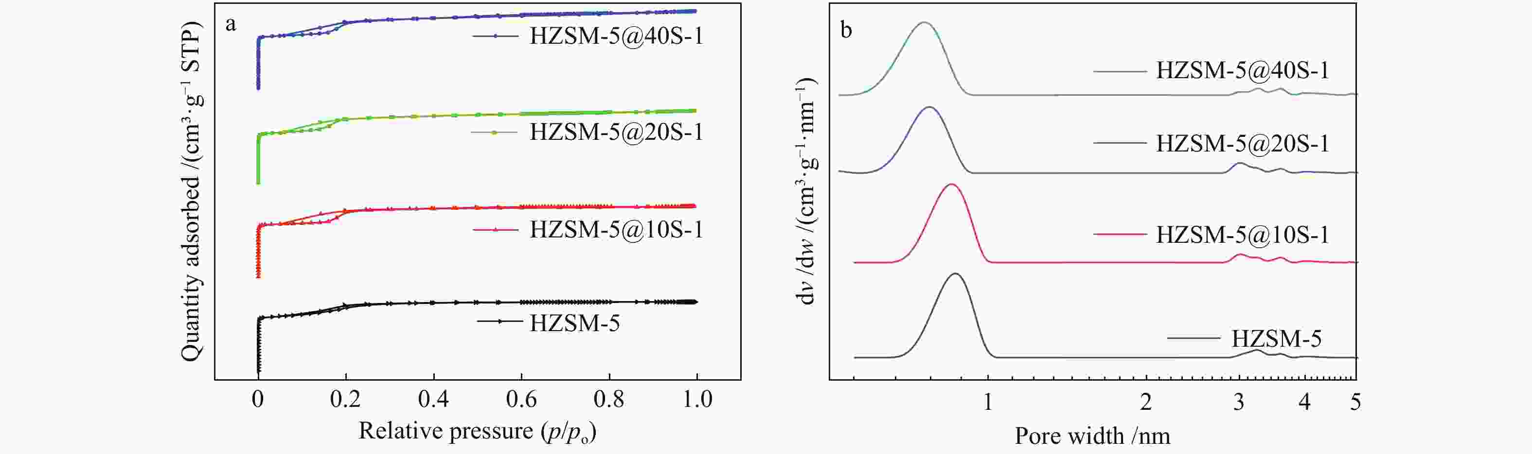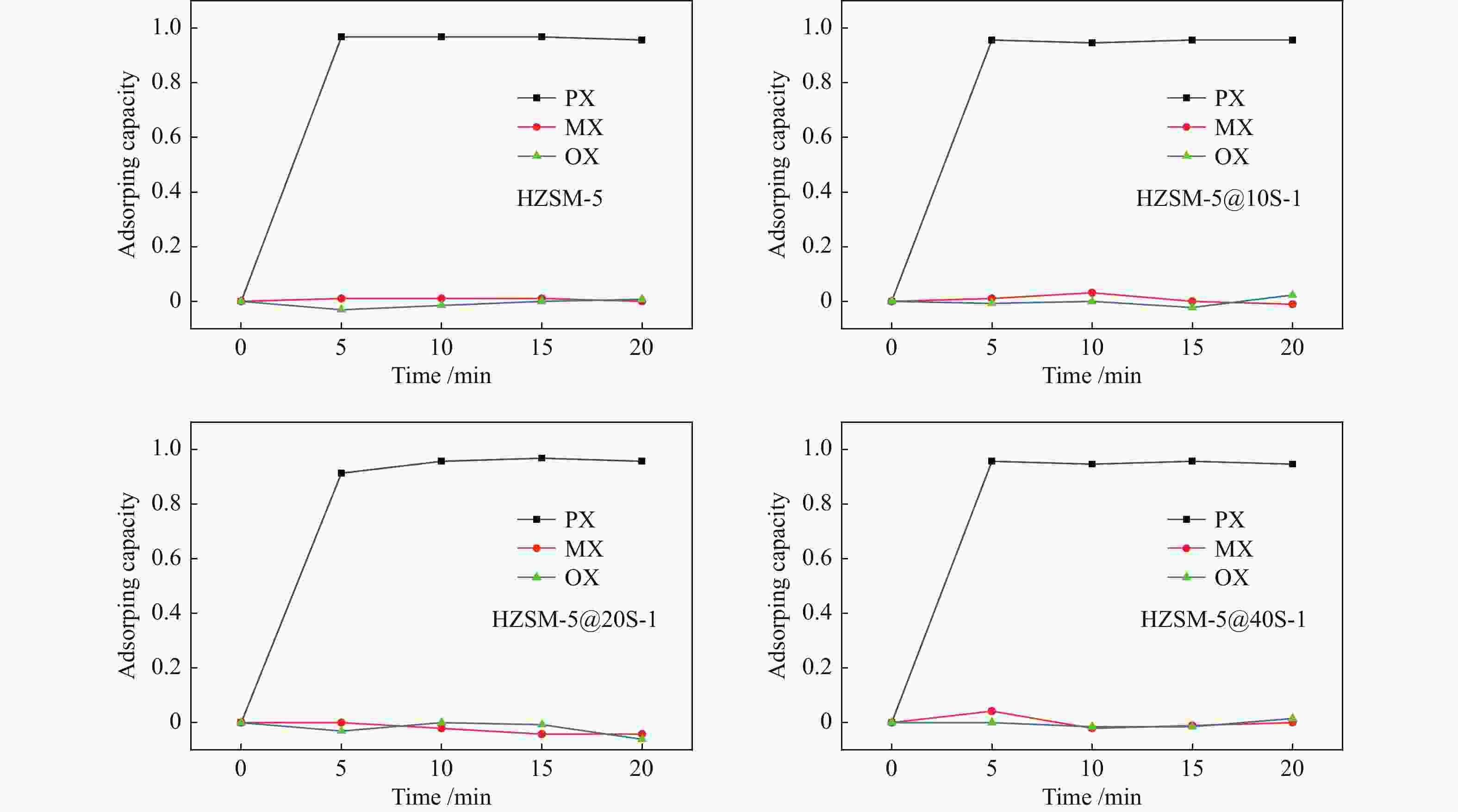 表 1 样品的Si/Al物质的量比 Table 1. Molar ratio Si / Al of the samples Sample Si/Al(mol ratio) HZSM-5 152 HZSM-5@10S-1 171 HZSM-5@20S-1 186 HZSM-5@40S-1 199 表 2 HZSM-5和HZSM-5@S-1分子筛的结构参数 Table 2. Structural properties of HZSM-5 and HZSM-5@S-1 molecular sieves Sample ${S} _{ {\rm{BET} } }^{\rm{a} } /$   ${S} _{ {\rm{micro} } }^{\rm{b} } /$   ${S} _{ {\rm{exter} } }^{\rm{b} } /$   ${v}_ {\rm{total} } /$   $v_{ {\rm{micro} } }^{\rm{b} } /$   $v_{ {\rm{meso} } }^{\rm{b} }/$   HZSM-5 370 288 82 0.18 0.12 0.06 HZSM-5@10S-1 351 250 101 0.18 0.11 0.07 HZSM-5@20S-1 339 240 99 0.18 0.10 0.08 HZSM-5@40S-1 351 260 91 0.20 0.11 0.09 a Calculated by the BET method; b Calculated using the t-plot method; c Calculated using vtotal −vmicro 表 3 探针分子PX、MX和OX的异构转化率 Table 3. isomerization conversion of probe molecules PX, MX and OX Sample PX isomerization conversion /% MX isomerization conversion /% OX isomerization conversion /% Black − − − HZSM-5 3.9 1.6 1.5 HZSM-5@10S-1 1.9 0.7 0.9 HZSM-5@20S-1 1.3 0.4 0.6 HZSM-5@40S-1 0.8 0.1 0.5