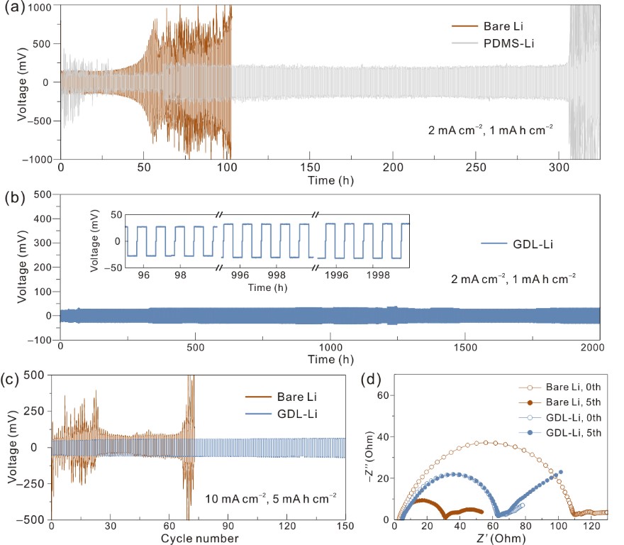 作者进一步对比不同电流密度下对称电池的长循环性能来确认保护层的作用(图3)。在2 mA cm−2的电流密度下,未修饰的锂金属负极和纯PDMS修饰的锂负极均在较短时间内发生短路。而保护层作用下的锂电极寿命可超过2000 h。值得一提的是,即使在超高电流密度(10 mA cm−2)和大容量(5 mA h cm−2)下,受Ga基保护层作用的对称电池仍能维持极其稳定的电压曲线,这证实了接触−消融机制在高锂离子通量下的稳定性。此外,在保护层作用下,全电池也展现出优异的倍率性能和循环稳定性,说明了其实际应用的潜力。