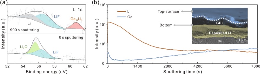 通过X射线光电子能谱的深度分析,作者证实了合金化产物是Ga14Li3。这与Ga发生电化学反应的产物截然不同,且锂在该合金中处于特殊的非键合状态,有利于在循环过程中锂离子的可逆脱出。二次离子质谱验证了锂沉积集中于保护层下方,说明锂离子能通过保护层并在其下方实现均匀沉积(图2)。