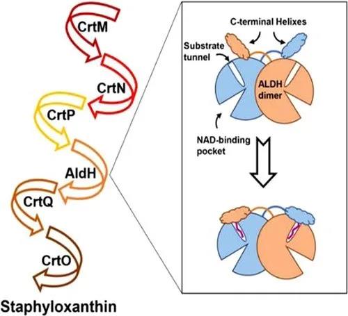 中山大学夏炜、香港大学孙红哲课题组通过解析金黄色葡萄球菌醛基脱氢酶纯蛋白以及复合物晶体结构,发现其特有的“C-helix”结构域在结合特异性底物过程中发生的构象变化,提出了金黄色葡萄球菌醛基脱氢酶识别特异性底物的分子门控机制,并通过一系列生化实验辅助验证。  金黄色葡萄球菌是一种常见人类病原菌,可引起一系列感染性疾病,由于抗生素的滥用,产生了许多耐药性的金黄色葡萄球菌,而相对于开发新的抗生素,发展新的抗感染疗法对于对抗病毒感染更为有效。超过90%的金黄色葡萄球菌临床分离株会产生一种金黄色的含有30个碳(C30)的长链类胡萝卜素分子,称为葡萄球菌黄素,该色素可作为抗氧化剂提高细菌对于活性氧的耐受能力。因此,阻断其生物合成途径是一项重要的工作。 葡萄球菌黄素的生物合成路径需要一系列催化酶的参与(图1)。其中,醛基脱氢酶(SaAldH)是最近被发现的参与色素合成的酶类,其功能是催化长链不饱和醛4,4’- diaponeurosporen-4-al生成对应的羧酸。近期,中山大学夏炜课题组以及香港大学孙红哲课题组报道了SaAldH纯蛋白以及其与特异性底物复合物的晶体结构,在分子层面揭示了SaAldH识别特异性底物——多不饱和长碳链脂肪醛的门控机制。  图1 葡萄球菌黄素合成通路示意图 从纯蛋白结构中,作者发现SaAldH二聚体除了保守的催化结构域、NAD结合结构域以及桥连结构域以外,在C端还具有独特的“C-helix”结构,类似于人源脂肪醛脱氢酶(FALDH)中的“gatekeeper helix”。将纯蛋白和复合物晶体结构对比后,发现“C-helix”在结合特异性底物之后发生了明显的构象变化(图2),朝着底物通道入口的方向转动了10.6°的夹角,从而使得氨基酸残基F456和F457的侧链插入到底物通道入口处,破坏了纯蛋白状态下F456、F457以及Y92形成的T型π-π堆叠相互作用。此外“C-helix”之前的loop区域的氨基酸V441和H442也向着底物通道入口的方向靠近,从而实现了底物口袋的闭合。因此作者们提出“C-helix”充当了重要的门控作用,在纯蛋白状态下,酶活口袋处于“开合”状态,允许底物的进入,而当酶结合了特异性底物之后,“C-helix”发生构象变化,在通道入口处形成位阻,锁住底物,使得酶活口袋处于“闭合”状态。 图2 SaAldH的“open-closed”构象变化 图2 SaAldH的“open-closed”构象变化通过对SaAldH和特异性底物之间的相互作用进行分析,作者们发现特异性底物与SaAldH底物结合通道中的氨基酸残基形成广泛的疏水相互作用。另外,酶序列上Y116与底物的2-甲基形成π–σ相互作用,F457与底物末端的两个甲基形成疏水相互作用,暗示着“C-helix”同时也参与了对特异性底物的识别(图3)。