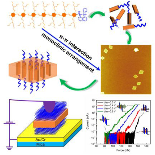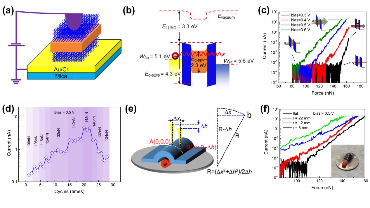 通过对所得菱形二维自组装形貌的组分分布进行探究,发现二维自组装形貌中半导体的PPV嵌段被上下两层的绝缘外延嵌段包夹着,组成了一种“三明治”结构。这种结构使得半导体和绝缘组分在二维形貌中得到了很好的分离,通过分子设计可以控制绝缘层的厚度,进而可以有效地控制基于二维材料构筑的隧穿器件的垂直电导率,并以此制造出纳米级的压力传感器(图2a)。所制备隧穿器件的开关电流比大于104,连通态时电流密度高达6000 A cm-2,具有极高的灵敏度与良好的耐受性(图2b-d)。同时用这种方法制备的隧穿器件在弯曲时仍然表现了不错的性能(图2e、f)。实验结果表明这些二维胶束型材料在微电子或电子机械传感领域有着广阔的应用前景,如果借助嵌段共聚物分子外接功能链与羟基或金属离子之间进行相互作用,甚至可以通过衬底工程实现图案化的器件设计。