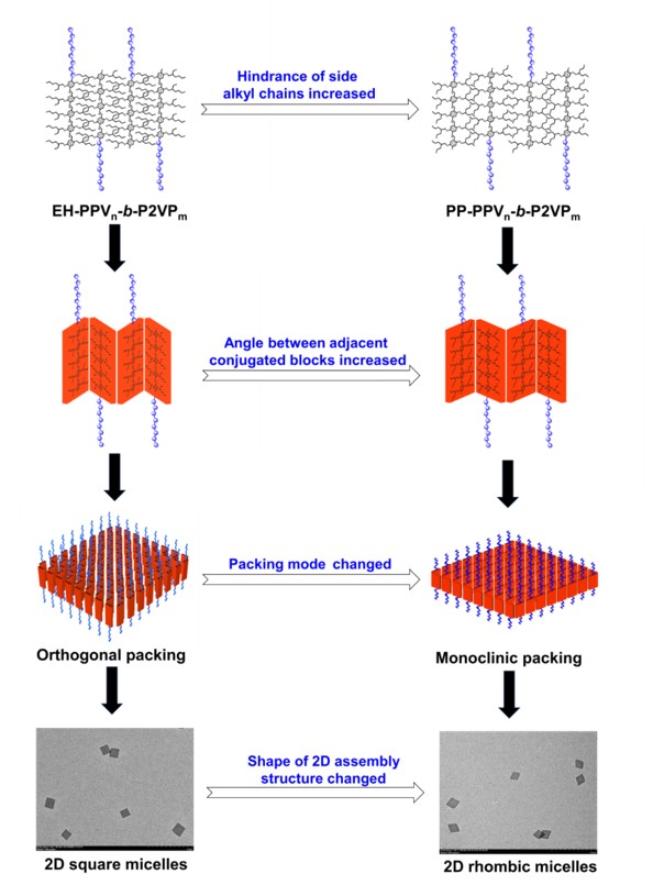 近期,南方科技大学的何凤课题组聚焦于具有半导体性质的共轭聚合物——聚对苯撑乙烯poly(p-phenylenevinylene) (PPV),以其作为成核嵌段成功了构筑嵌段共聚物。通过溶剂亲疏作用与分子间的π-π相互作用,在特定的溶剂中,这些嵌段共聚物可以形成规则均一的菱形二维自组装形貌。通过改变溶液浓度与分子嵌段比,可以实现形貌尺寸的精确控制。与该课题组之前的研究对比,可以发现通过调整共轭骨架两侧的烷基链,可以改变分子间π-π相互作用的空间位阻,不同的位阻导致分子堆积由正交排列转变为单斜排列,从而从宏观上观察到相似结构的嵌段共聚物形成的二维自组装形貌由正方形转变为菱形(图1)。这种二维自组装形貌的构筑策略是具有普适性的。