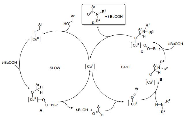 反应机理如Scheme 1: A分子内β-氢脱掉生成苯甲醛和叔丁醇同时生成有活性的二价铜, 生成的苯甲醛和铜离子络合物和自由胺、碳酸钙反应生成中间体B, 在过氧化物的存在下B进化成C, 接着β-氢离去生成酰胺 D, 并且再次生成二价铜催化剂.实验表明第一次催化循环即氧化成醛是比第二次催化循环即醛的酰胺化要慢.