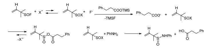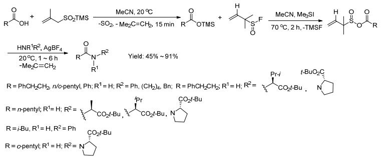 2013年Vogel等[24]用羧酸和亚磺酸三甲基硅烷在20 ℃下快速反应生成羧酸三甲硅烷盐, 得到的产物不做处理, 反应液直接升温到70 ℃再和亚硫酰氟反应生成羧酸和亚磺酸的混合酸酐, 再和胺、四氟硼酸银在20 ℃下反应生成最终产物酰胺 (Scheme 10).该反应是通过一锅法实现, 反应过程中释放出易挥发的二氧化硫、异丁烯和三甲基氟硅烷.
