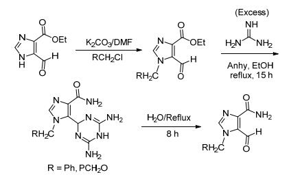 2005年Hosmane小组[28]用异咪唑插烯酯和过量的胍反应生成酰胺.碳酸钾催化酯和卤代烃发生烷基化反应, 得到产物和过量胍在无水乙醇中回流15 h, 得到醛基被保护的酰胺, 再在水中回流8 h, 去保护得到含甲酰基的酰胺 (Scheme 12).因底物中含有活泼性好的醛基, 和一般的胺反应, 醛基也会参与反应, 而改用过量的胍作为胺的来源, 即解决了上述的问题, 也可以起到对基团的保护作用, 对于应用到其它反应中也是一种很好的办法, 且去保护也比较简单, 不会给整个方案带来额外复杂步骤.