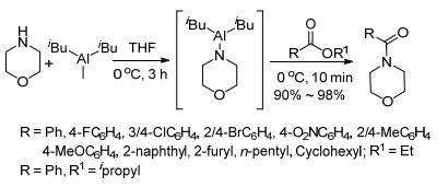 2014年An小组[29]用二异丁基 (吗啉) 铝和酯反应制备酰胺.用吗啉和三烷基铝在0 ℃下反应3 h得到中间体, 再和酯反应10 min, 即得到吗啉酰胺 (Scheme 13).