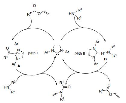 2015年Mecinovic等[30]和Wang等[31]分别提出用锆的二茂铁和1-甲基-3-(3-磺丙基) 咪唑磷钨酸盐催化饱和酯和胺反应制备酰胺.反应操作简便, 收率高, 且底物应用范围广, 催化剂可回收使用, 实际应用前景光明.除用饱和酯作为底物制备酰胺, Du等[32]又以不饱和酯为原料, N-杂环卡宾为催化剂和胺在60 ℃下反应得到酰胺 (Eq. 14).反应机理如Scheme 14.