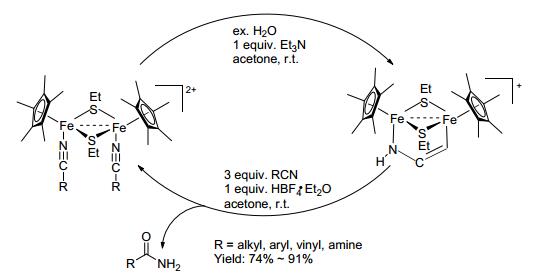 2015年Qu等[38]用硫桥双核铁复合物帮助腈水解成酰胺 (Scheme 16). 2016年Jin等[39]用双氧水, 在室温、碱性条件下帮助高分子腈水解成酰胺高分子 (Eq. 20).