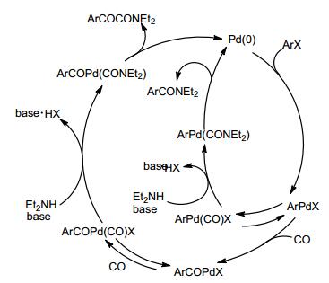 2003年Inoue等[41]发现PNNP型双核钯络合物可以有效地催化卤代烃和胺发生双羰基化反应.磷酸钾作碱, 1, 4-二氧六环作溶剂, 碘代烃和一氧化碳在催化剂的作用下反应15 h, 得到两种酰胺 (Eq. 22).碘苯做原料选择性可达到96%, 2-碘代呋喃参与反应选择性可以达到100%.卤代烃的双羰基化机理如Scheme 17.