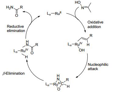 反应机理如Scheme 18, 第一步催化剂和肟氧化加成, 再亲核加成, 接着发生β-消除, 最后还原消除得到酰胺.