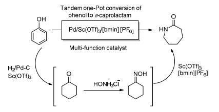 2013年Lee等[47]用苯酚作为原料一锅法合成己内酰胺, 钯/三氟甲烷磺酸钪/离子液体1-丁基-3-甲基咪唑六氟磷酸盐作为多功能催化剂催化苯酚经肟中间体转变成酰胺 (Scheme 19).苯酚先由钯/三氟甲烷磺酸钪在氢气的存在下共同催化氢化生成环己酮, 再由三氟甲基磺酸钪/离子液体1-丁基-3-甲基咪唑六氟磷酸盐共同催化得到的环己酮肟发生贝克曼重排得到己内酰胺.整个催化体系作为一种多功能催化剂, 将会有着更加广泛的使用性.