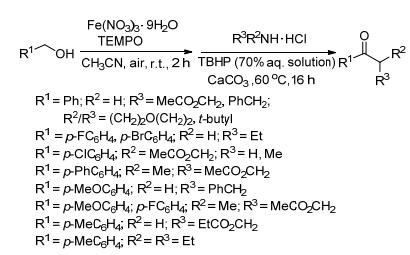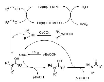 机理如Scheme 3: Fe-TEMPO介导氧化醇生成醛, 然后和胺在原位发生反应形成半缩醛中间体, 进一步通过游离基机理被Fe-TBHP催化氧化.