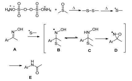 反应机理如Scheme 20:过硫酸铵和二甲基亚砜在加热条件下生成甲基硫自由基, 再和肟A反应经过B、C、D自由基的转变得到酰胺.