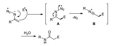 机理如Scheme 21.烯烃叠氮化合物亲核进攻碳亲电子体, 形成中间体亚氨基重氮离子A, 接着释放出氮气, 生成腈离子中间体B, 最后水解得到酰胺.但这些过程中是需要过量的三氟硼酸乙醚参与反应的, 烯烃基叠氮化合物的缓慢加成, 防止叠氮化合物的分解.