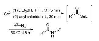 2016年Lüdtke等[53]用硒化学一锅法合成糖基酰胺 (Scheme 22), 可避免处理含硒化合物, 简化处理反应步骤.硒先经三乙基硼氢化锂还原成Se2-, 再和具有活性的羧酸衍生物反应, 在原位上生成硒羧酸盐, 再加入含糖基的叠氮化合物, 发生环加成反应, 生成中间体硒三唑, 最后分解生成酰胺, 并释放出氮气和硒.
