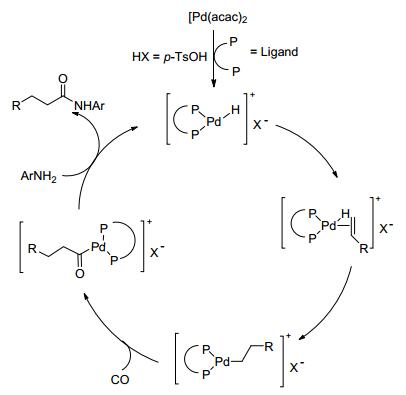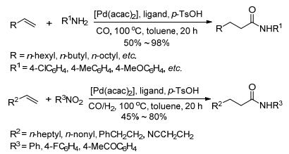 2013年Beller等[60]开发出一种基于钯的催化体系, 用于烯烃分别和含胺基和硝基的化合物有选择性地氨基羰基化生成烷基酰胺 (Scheme 23).胺参与反应机理如Scheme 24.