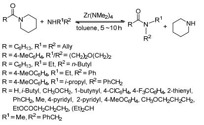 2009年Stephenson等[61]利用高效经济的锆和铪氨基复合物实现叔酰胺与仲胺的相互转换生成新的酰胺 (Scheme 25).在甲苯做溶剂下, 大部分底物在空气环境下就可以发生互换反应, 脂肪族酰胺的活性要高于芳香族酰胺, 脂肪族在室温下即可完成反应, 芳香族需要50 ℃的温度下才能发生转变.该反应是个可逆反应, 在相同条件下, 反应物与产物是可以互相转换的.