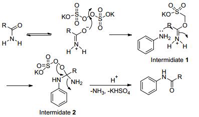 具体的反应历程如Scheme 26.酰胺和过硫酸钾混合下, 会促使过硫酸钾的过氧键发生断裂, 生成中间体1, 胺对1加成后得到中间体2, 最后释放放出氨气和硫酸氢钾得到新的酰胺.