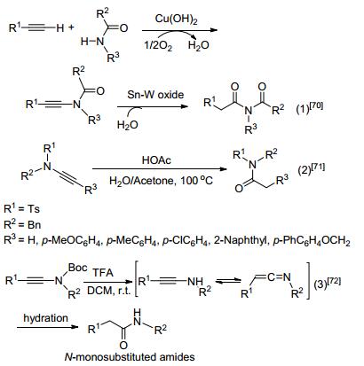 炔酰胺是一种典型的缺电子酰胺, 关于它的描述要追述到1972年Viehe所做的先驱工作[63]. 2012年Jin等[64]利用端位炔和酰胺在氢氧化铜催化剂作用下, 相互耦合得到炔酰胺, 再在锡和钨的混合催化氧化下, 水解得到酰亚胺. 2015年Xu等[65]用炔酰胺和乙酸在100 ℃高温下, 用水和丙酮做混合溶剂发生水解反应得到N-酰基磺酰胺化合物, 产物经过滤就可分离出来. 2016年Huang等[66]用三氟乙酸做介导炔酰胺发生水解得到新的酰胺 (Scheme 27).