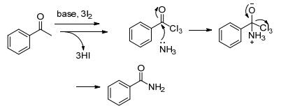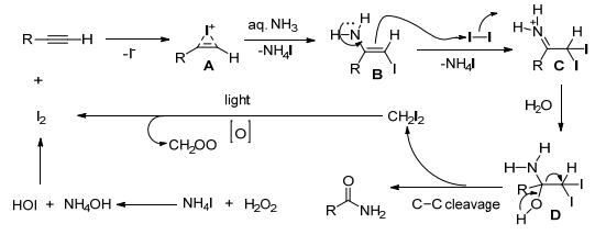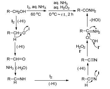 Scheme 28描述了整个反应的历程:该方法分两步, 第一步是醇和氨水在碘的催化下生成相应的腈; 第二步腈在碱性条件用过氧化氢氧化水解得到酰胺.