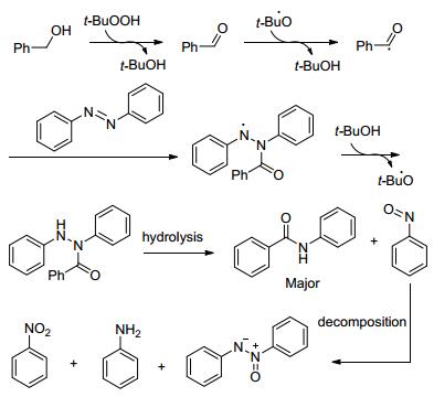 反应机理如Scheme 4:苯甲醇先被过氧化物氧化成醛, 再转变成自由基, 偶氮苯和自由基反应生成中间体, 再吸引叔丁基过氧化氢上的氢原子得到另一中间体, 最后水解得到酰胺.