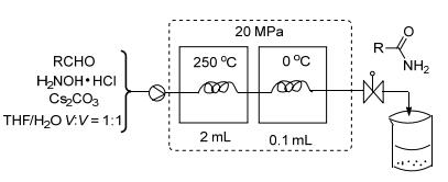 2014年Ambreen等[17]使用流体化学对酰胺的合成工艺进行研究.该反应必须在高温、高压下进行, 醛和羟胺盐酸盐, 在250 ℃, 20 MPa下反应48 h, 得到酰胺 (Eq. 8).