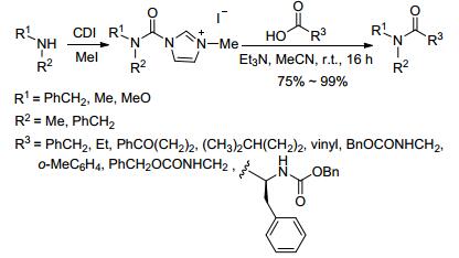 2003年Grzyb小组[21]用羧酸和胺甲酰咪唑盐在弱碱性下室温反应16 h得到叔酰胺.咪唑盐是由仲胺和N-N'-羰基二咪唑 (CDI) 反应, 接着用碘甲烷甲基化得到 (Scheme 6).咪唑盐在通常情况下是固体结晶, 比氨基甲酰氯稳定得多, 可以长时间的储存, 如此就更加方便地用于酰胺的合成.