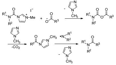 反应机理如Scheme 7:胺甲酰咪唑盐和羧酸阴离子反应释放出N-甲基咪唑, 生成酸酐, 接着N-甲基咪唑进攻酸酐, 释放出二氧化碳和游离胺的同时, 生成烷基酰咪唑, 再和游离胺的反应生成最后产物酰胺.