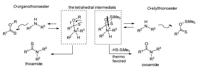 2011年Liebeskind等[22]发现硫代羧酸直接与胺反应活性很低, 得到的产物收率也低.于是该组在反应中加入了N, N-二 (三甲基硅基) 乙酰胺 (BSA), 提高反应效率.硫代羧酸和BSA快速 (4 min) 反应成O-硅烷基硫羰酯, 这是一种在原位上被活化的酯, 接着和胺发生高效率反应生成酰胺 (Eq. 10).反应机理如Scheme 8.