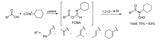 2012年Townsend等[23]用α, β-不饱和羧酸和异腈在微波的辅助下发生双组份偶联生成FCMA (formimidate-carboxylate mixed anhydride) 的中间体, 再通过1, 3-O-N的迁移得到N-甲酰基酰胺 (Scheme 9).产物是含有双键的酰胺, 因氮上连有甲酰基, 使得该类物质活性增强, 可以作为亲双烯体发生DA反应[28].