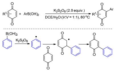 醌及其衍生物由于其独特的生物活性和光电性能使其在药物、染料和光敏材料等领域具有广泛应用价值.醌类衍生物最简单的制备方法是以易得的醌为起始原料, 通过碳-氢键的直接官能团化得到.在Baran工作[22a]的基础上, Ilangovan等[22b]发现只需要在过硫酸盐的氧化下, 芳基硼酸就可以与醌发生碳-氢键的直接官能团化, 得到一系列芳基取代的醌(Scheme 10).作者认为反应有可能是经过过硫酸盐氧化芳基硼酸产生芳基自由基中间体(•Ar)进行的.该反应为醌类化合物的衍生化提供了简单、实用的新方法.