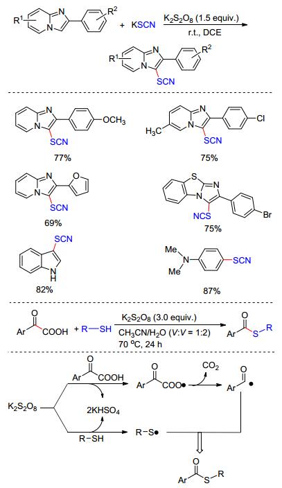 C—S键是一种广泛存在于具有生物活性的分子中, 包括磺酰胺类抗生素和哮喘药物顺尔宁抗生素等.并且含硫有机物在化工、材料领域都有很广泛的应用, 这使得C—S键的构筑在有机合成中具有重要的地位, C—S键的构筑已经引起有机合成化学家的广泛关注. 2015年, Wang课题组[24a]报道了K2S2O8促进的咪唑并吡啶C-3位硫氰化反应, 在温和条件下以KSCN为硫源高效地形成C—S键, 反应不受电子效应和位阻效应的影响, 各种取代的原料均以较高的收率制备一系列具有生物活性的咪唑并吡啶衍生物, 该方法也可用于其他杂环化合物如噻唑、吲哚等的修饰(Scheme 11).此外, 巯基也能在氧化条件下产生硫自由基用于构建C—S键, 该课题组发现苯硫酚在过硫酸盐条件下能与苯甲酰甲酸发生脱羧偶联反应, 合成一系列硫代羧酸酯衍生物.其中, 作者推测其K2S2O8同时氧化苯硫酚和苯甲酰甲酸各自产生硫自由基和脱CO2后的苯甲酰基自由基, 然后发生自由基-自由基偶联完成转化[24b](Scheme 11).