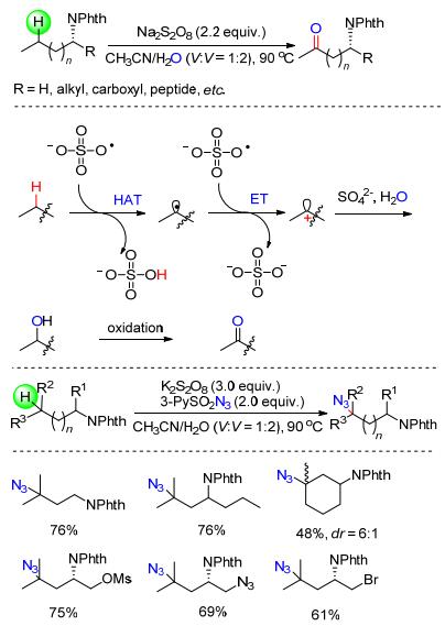 含有sp3杂化的碳-氢键的官能团化反应是有机化学中极具挑战性的课题之一. 2016年, Shi等[25a]以Na2S2O8为氧化剂实现了胺以及氨基酸衍生物远程的脂肪碳-氢键的高选择性氧化.该反应具有良好的底物普适性, 各种含氨基的化合物, 包括一系列的伯胺、氨基酸以及二肽都可高效地发生碳-氢键氧化反应.此外, 作者对反应的机理进行了深入的研究, 通过18O标记实验发现产物中的氧并非来自氧气或过硫酸盐而是来自于水.在反应体系中加入自由基捕获剂如TEMPO后反应明显被抑制, 意味着该反应有可能是自由基历程(Scheme 12).在上述工作的基础上, 该研究小组[25b]以K2S2O8为作为氧化剂, 3-PySO2N3作为叠氮源又实现了邻苯二甲酰胺保护的胺类化合物远程碳-氢键的叠氮化反应(Scheme 12).值得一提的是, 该反应的选择性非常好, 底物中的三级C—H键的反应活性远大于二级C—H键.这一结果完全符合自由基中间体反应的特征.由于诱导效应会影响不同三级C—H键的电子云密度, 这直接导致了叠氮化容易发生在富电子的远端的三级C—H键.