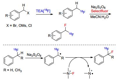 二氟亚甲基常被用于与药物分子骨架和具有生物活性分子的设计中, 这是由于二氟亚甲基具有良好的亲脂性和代谢稳定性.最近, Liang课题组[25c]报道了过硫酸盐促进的苄基C(sp3)—H的氟化反应, 制备了一系列F18取代的芳基二氟甲烷产物.甲苯衍生物在过硫酸盐的促进下产生苄基自由基, 该自由基中间体与Selectfluor产生的氟自由基通过自由基-自由基偶联得到产物(Scheme 13).利用过硫酸盐氧化的方法, Singh等[25d]也实现了甲苯衍生物自身的氧化偶联反应, 该反应也是通过苄基自由基中间体进行的.
