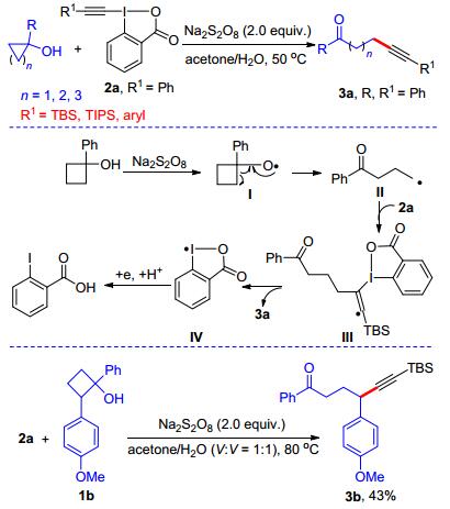 此外, 我们利用过硫酸盐氧化的方法, 还实现了张力环醇与高价碘炔的氧化开环-炔基化反应(Scheme 15)[29d].该反应弥补了前面α-酮酸脱羧-炔基化反应只能合成α-炔基酮的局限性, 可以用来合成碳链较长的炔酮化合物.我们认为该反应经历如下的路径:首先K2S2O8单电子氧化环丁醇使其产生烷氧基自由基Ⅰ.该中间体发生自由基重排开环得到稳定的烷基自由基Ⅱ, 烷基自由基对高价碘炔选择性加成消除后即可得到δ-炔酮衍生物.此反应也适用于环张力较大的三元环或环张力较小的五元环, 实现一系列远程炔酮的合成.值得一提的是, 当以1, 2-二芳基取代的环丁醇1b为反应底物时, 碳-碳键的裂解发生在连有取代基较多的一端, 这与过渡金属催化的环烷醇裂解反应选择性完全不同[30], 进一步说明该反应是经过自由基中间体进行的.