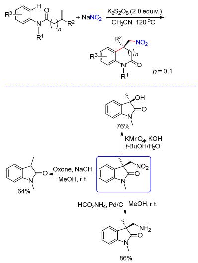 近年来, 丙烯酰胺的烯烃双官能团化反应已经发展成为合成羟吲哚化合物的有效方法之一.不同类型的自由基前体化合物均可与N-苯基丙烯酰胺高效地发生串联自由基加成/环化反应, 生成各种官能团化的羟吲哚化合物[8a~8c]. 2013年, Yang等[7d]在无过渡金属的存在下, 利用廉价易得的K2S2O8作为氧化剂, 以NaNO2作为硝基自由基(•NO2)前体, 实现了NaNO2与N-苯基丙烯酰胺的自由基环化反应, 合成一系列硝乙基取代的羟吲哚化合物(Scheme 2).该反应具有良好的底物普适性和官能团容忍性.此外, 作者还对产物中的硝基进行了衍生化, 制备出了不同官能团化的羟吲哚化合物.后来, Zhang等[8e]利用类似的策略以NaN3为叠氮源, 实现了N-苯基丙烯酰胺的自由基环化叠氮化反应, 成功地将叠氮基引入到了羟吲哚分子中(Eq. 1).