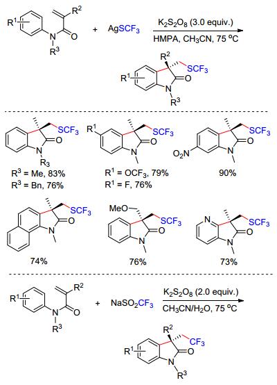 硫三氟甲基(SCF3)具有强负电子以及良好的亲油性, 在药物、农药的分子中引入SCF3能够极大地改进这些化合物的活性.因此, 发展高效的引入SCF3的反应备受合成化学家的关注. 2014年Wang等[10a]报道了K2S2O8促进的N-芳基丙烯酰胺与硫三氟甲基试剂的串联环化反应(Scheme 3).作者认为在K2S2O8的存在下, 硫三氟甲基银(AgSCF3)被氧化生成Ag(Ⅱ)SCF3中间体, 该中间体经过单电子转移(SET)产生硫三氟甲基自由基(•SCF3), 进而完成后续的环化反应. AgSCF3在该反应中不仅作为硫三氟甲基试剂使用, 还起到氧化的作用.该反应中选择AgSCF3至关重要, 类似的试剂CuSCF3并不能得到预期的目标产物.此外, Wang等[10b]利用K2S2O8单电子氧化实现了廉价易得的Langlois (CF3SO2Na)试剂与N-苯基丙烯酰胺的自由基环化, 高产率地得到三氟乙基取代的羟吲哚.