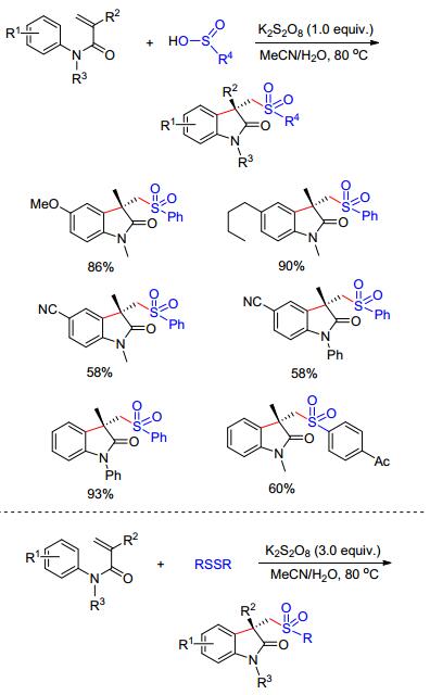 过硫酸盐作为廉价、易得的单电子氧化剂在羟吲哚的合成上表现出良好的活性.多种类型的化合物在无过渡金属催化下, 仅以化学当量过硫酸盐为氧化剂就可产生不同类型的活性自由基中间体.这些自由基中间体可进一步被N-苯基丙烯酰胺所捕获, 从而为合成各种不同取代基的羟吲哚环化合物提供了简洁、实用的新方法.