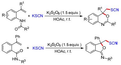 苯并噁嗪是一类非常重要的含氧、氮的六元杂环化合物.其可发生聚合反应形成类似酚醛树脂的含氮网络结构, 这种苯并噁嗪树脂作为一种新型的热固性树脂, 具有优良的电绝缘性、高的热氧稳定性和良好的阻燃性.此外, 该骨架广泛存在于一些药物分子中, 如抗焦虑和抗惊厥的药物“Etifoxine”. 2015年, 我们小组[16a]发现在K2S2O8的氧化下, 廉价、易得的硫氰酸钾(KSCN)可以生成亲电的硫氰基自由基(•SCN), 该自由基可以高选择性的与烯基取代的酰胺发生加成/环化反应, 得到各种硫氰基取代的苯并噁嗪.利用该策略, 我们通过改变烯基酰胺的结构, 还成功地制备出一系列含亚胺基-异苯并呋喃类化合物(Scheme 5).在此基础上, 我们又实现了硫氰基取代二氢呋喃和苯并内脂类化合物的合成[16b].以上反应均表现出反应条件温和、底物适用范围广及官能团容忍性好等优点, 为合成含硫氰基的杂环化合物提供了新思路.值得一提的是, 产物分子中的SCN基团可以通过水解、还原、环加成等化学转化来制备结构多样的含硫化合物.因此, 该反应也为C—S键的构筑及结构多样性含硫化合物的合成提供了高效、绿色的新方法.