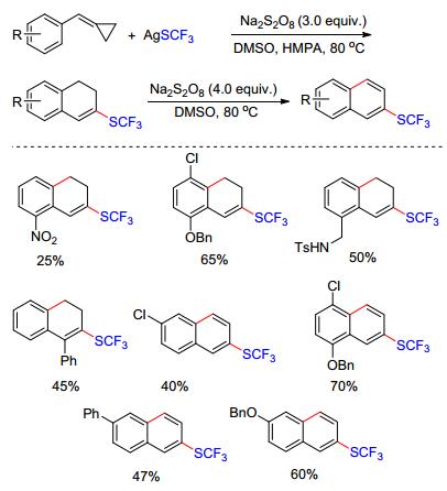 除了杂环化合物外, Shi等[17]利用过硫酸盐促进的自由基环化的策略实现了碳环化合物的合成.在化学当量Na2S2O8的氧化下, AgSCF3产生的亲电硫三氟甲基自由基(•SCF3)可对芳基取代的甲叉基环丙烷进行选择性的加成, 随后经开环、分子内环化得到硫三氟甲基取代的二氢萘产物.遗憾的是, 由于甲叉基环丙烷不稳定且在该体系中容易被氧化, 因此产率不是十分理想.作者发现, 在当采用4 equiv. Na2S2O8为氧化剂时, 二氢萘产物可脱氢生成芳构化的产物. Na2S2O8参与了两步氧化过程:第一步氧化AgSCF3产生SCF3•自由基, 第二步氧化反应中间体, 使得该中间体易于脱氢芳构化(Scheme 6).