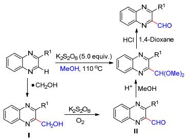 2013年, Liu等[19]发现在K2S2O8促进下喹喔啉或苯并噻唑可以与甲醇发生自由基的偶联反应, 一步得到2-喹喔啉或2-苯并噻唑甲醛二甲缩醛(Scheme 7).该缩醛类化合物在酸性条件下, 可进一步转化为醛基, 这为在杂环化合物中引入醛基提供了简洁、方便的新方法.初步的机理研究表明, 该反应经历了关键的中间体——Minisci羟甲基化产物Ⅰ.羟甲基自由基(•CH2OH)来源于过硫酸盐对甲醇的氧化.化合物Ⅰ在K2S2O8及氧气存在下, 经多步转化形成醛Ⅱ, 其在酸性条件下进一步与甲醇作用最终形成二甲缩醛产物.
