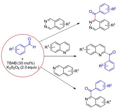 在季铵盐的催化下, 2-苯基苯甲醛在K2S2O8的氧化下可发生分子内环化反应, 生成不同取代的芴酮(Eq. 10)[20a].该反应中四乙基溴化铵(TEAB)的存在有利于使过硫酸盐产生硫酸根自由基负离子(SO4-·).该自由基负离子氧化2-苯基苯甲醛产生酰基自由基中间体, 紧接着发生分子内自由基环化得到预期的目标产物.相比于传统的过渡金属催化和酸催化的Friedel-Crafts方法, 该反应具有反应催化体系廉价、容易操作、实用性强等优点.在类似的反应体系下, Prabhu等[20b]还实现了醛与杂芳环化合物如异喹啉、喹啉及喹喔啉的交叉脱氢偶联(CDC偶联), 为杂环化合物的酰化反应提供了新方法. K2S2O8与四丁基卤化铵盐同样对该反应是缺一不可的, 并且在该廉价的体系下, 无论是芳香醛, 还是脂肪醛都能很好地参与反应(Scheme 8).