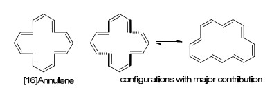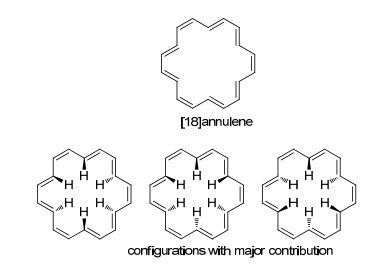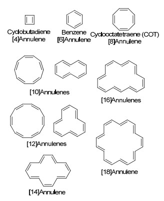 轮烯, 又称为[n]轮烯([n]annulene, 图 12), 最初由Sondheimer命名[89], 是指单双键交替的全碳单环分子(实际上除了图示中[10]轮烯、[12]轮烯可能有异构体, 其他更大的环系也可能存在多种异构体, 这里不再列出).值得注意的是, 大于8元环后的每个经典的全顺(All-cis)结构, 一般都会受到碳键角的张力约束而发生异构.